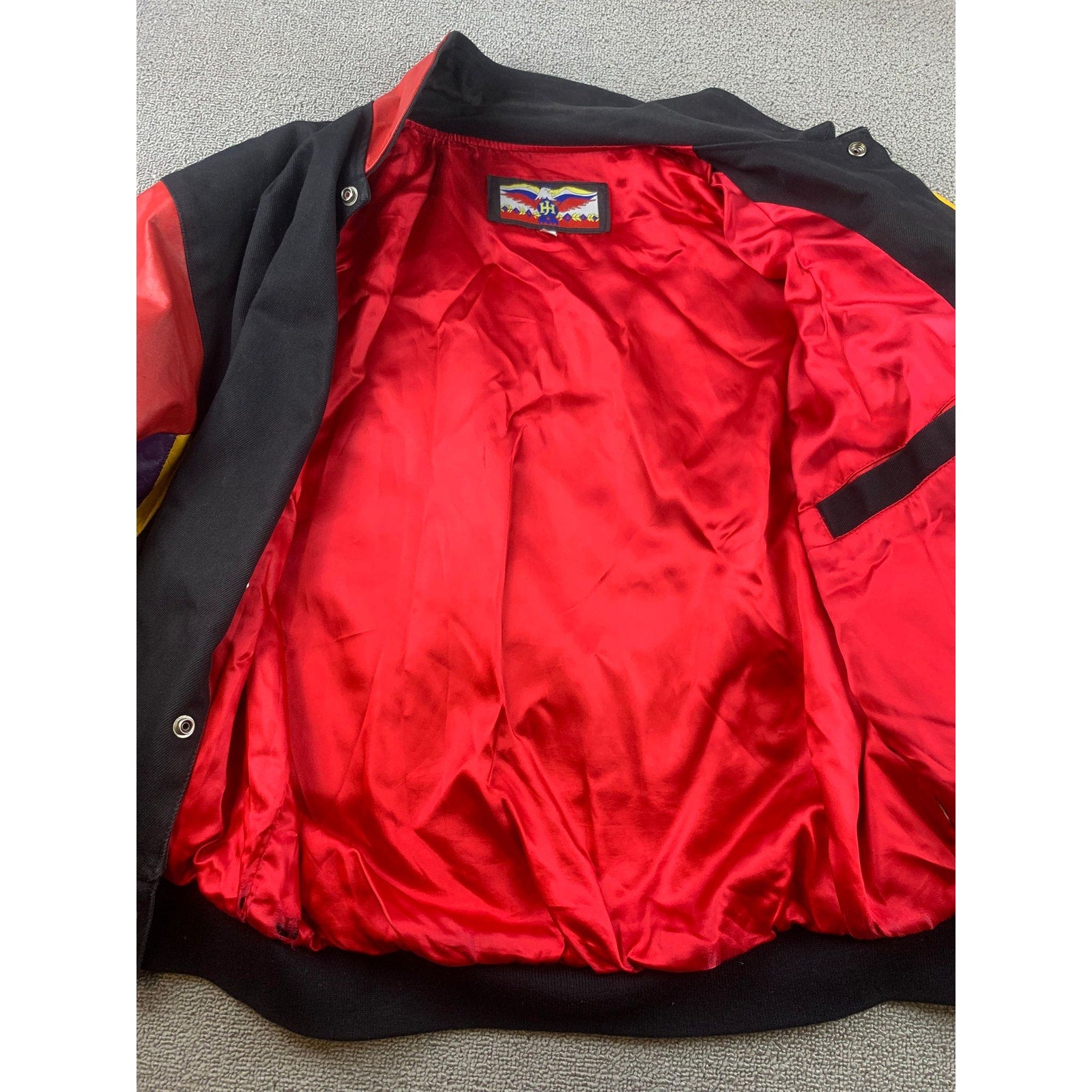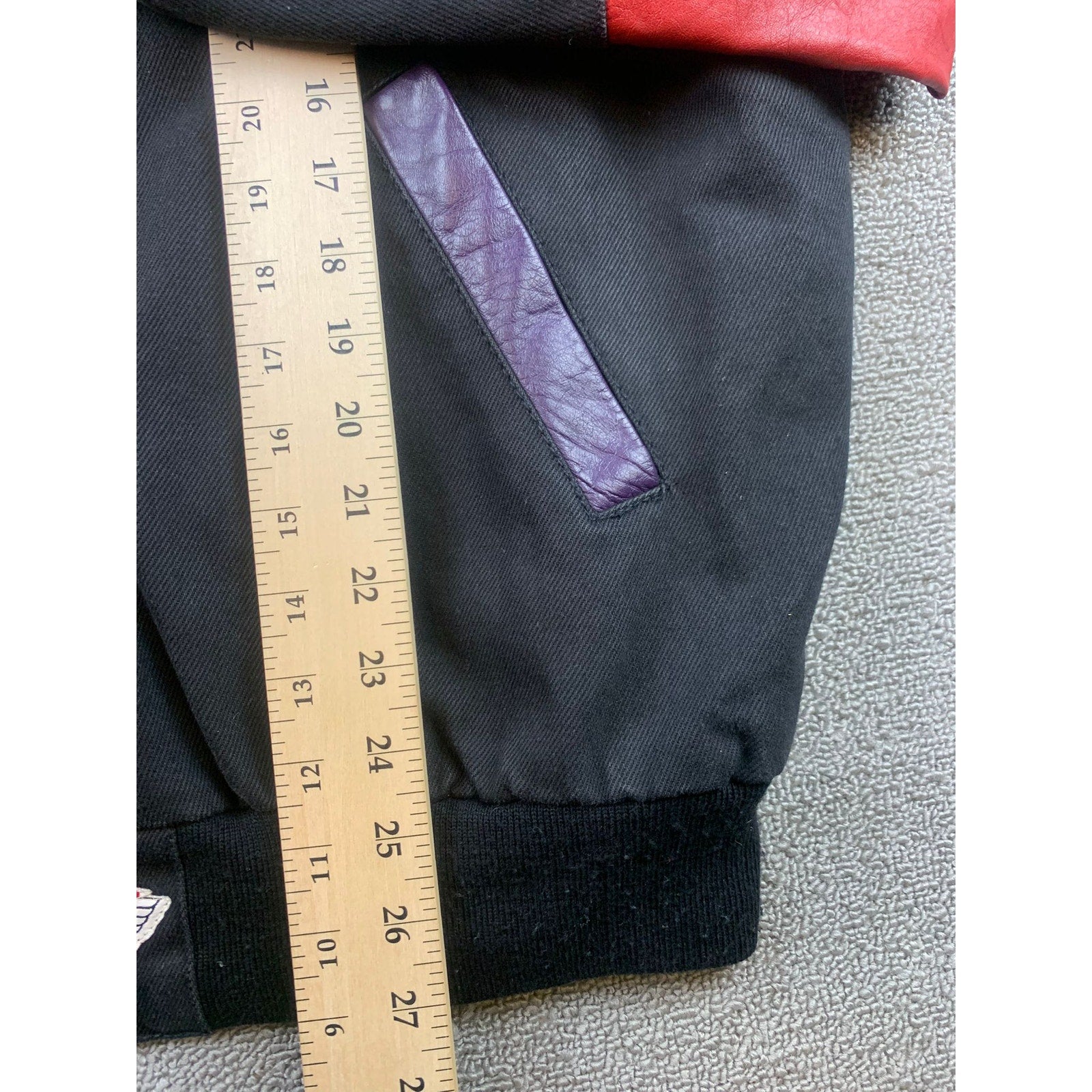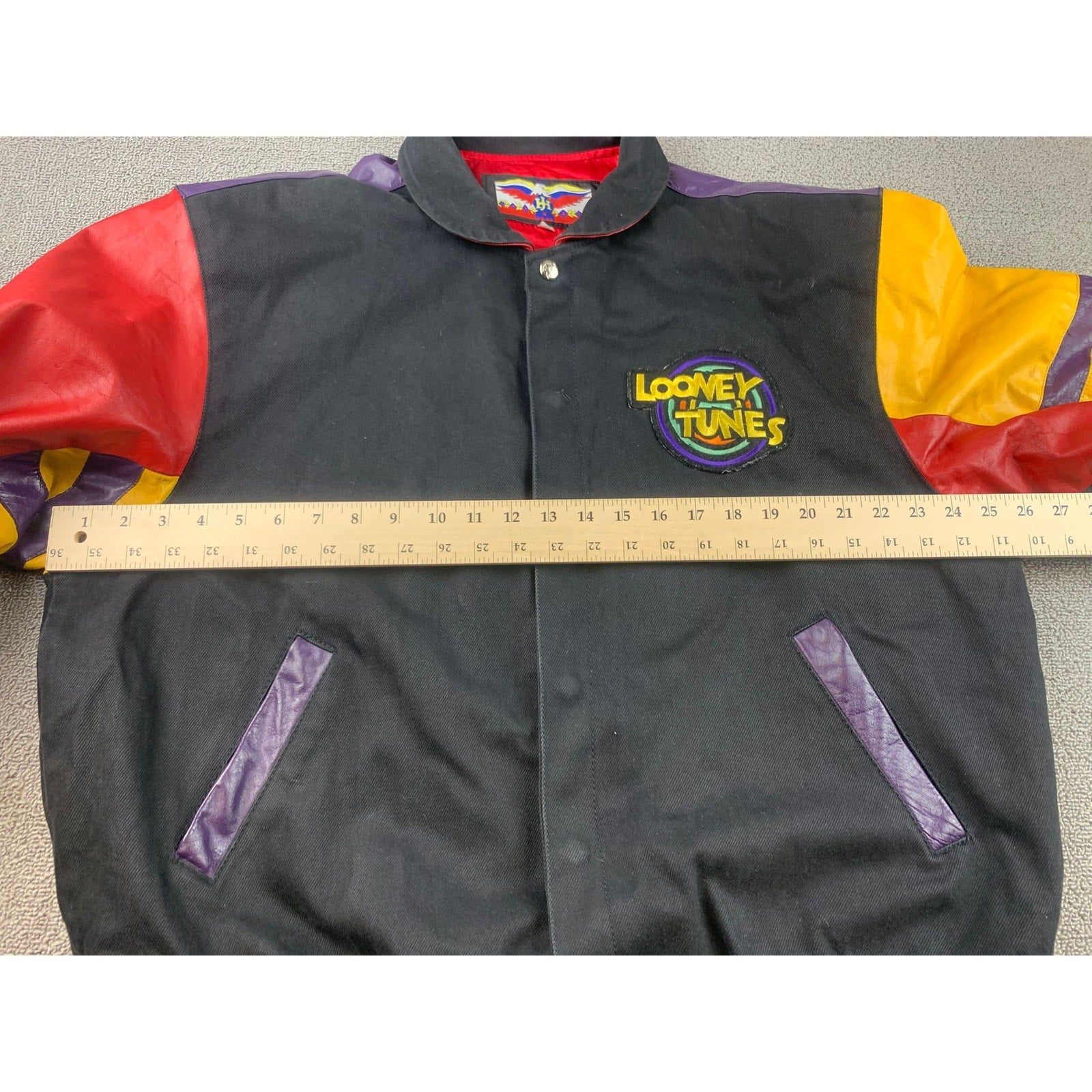 Vintage Looney Tunes varsity bomber jacket featuring bold color block leather sleeves in red, yellow, and purple with embroidered Looney Tunes logo on chest. Black body with ribbed hem and cuffs. Unique embroidered eagle inside tag. Snap button front closure with two side pockets. True 90s retro collectible piece.
