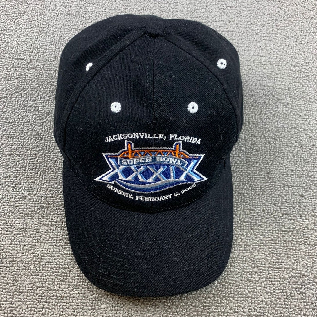 Commemorative NFL baseball cap from Super Bowl XXXIX, in Jacksonville, Florida. Features the official NFL shield label inside and prominently displays the Super Bowl XXXIX logo with “Jacksonville, Florida” embroidery—perfect for sports memorabilia collectors or fans celebrating the Patriots’ win. The strap-back closure ensures a comfortable, adjustable fit.