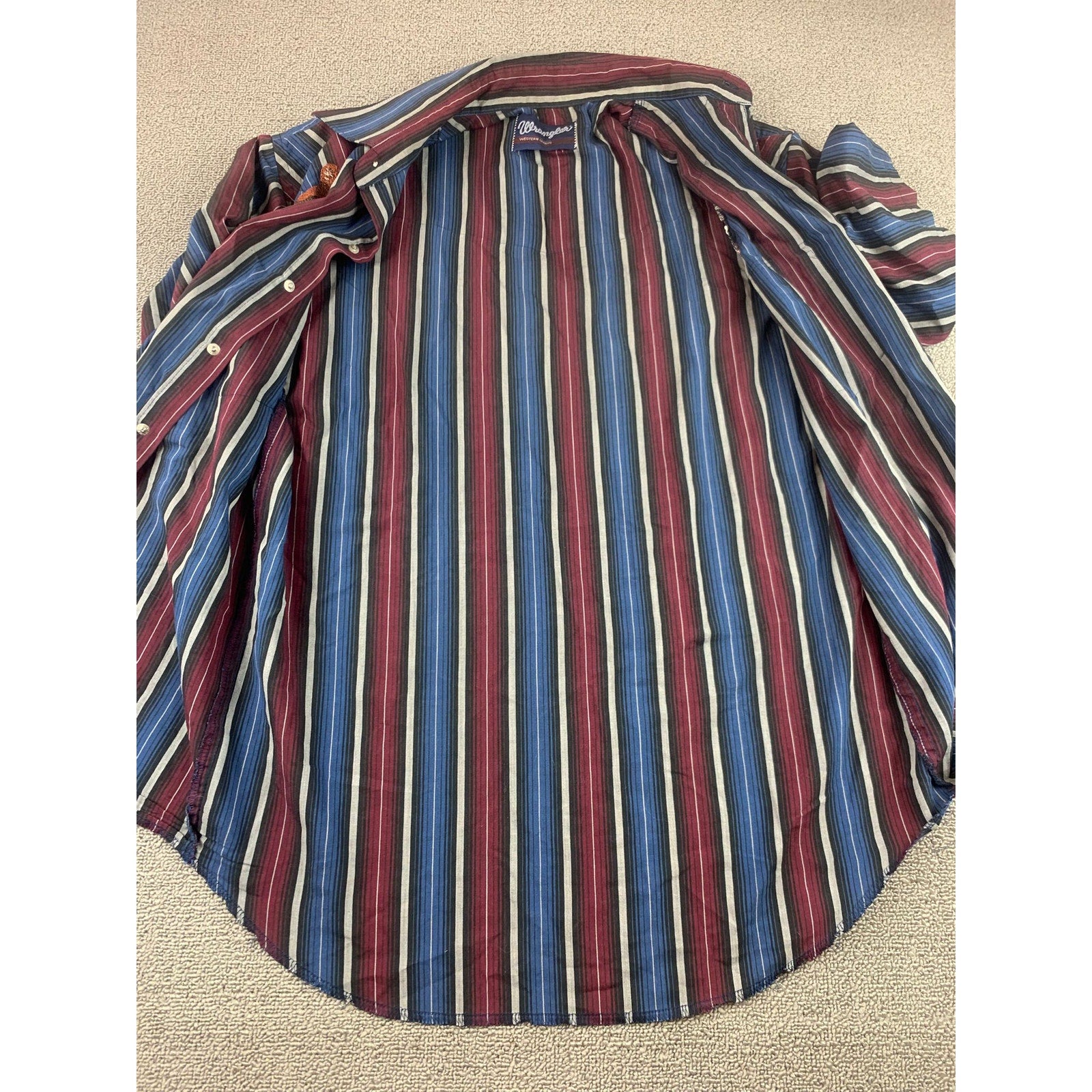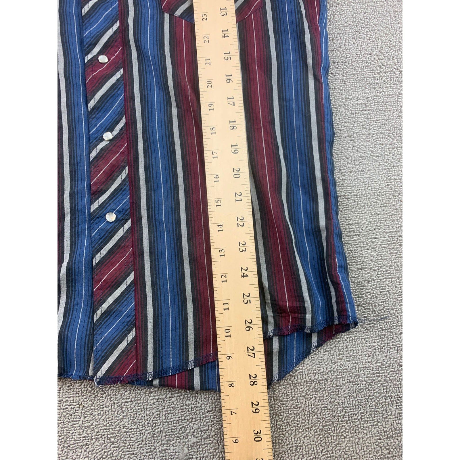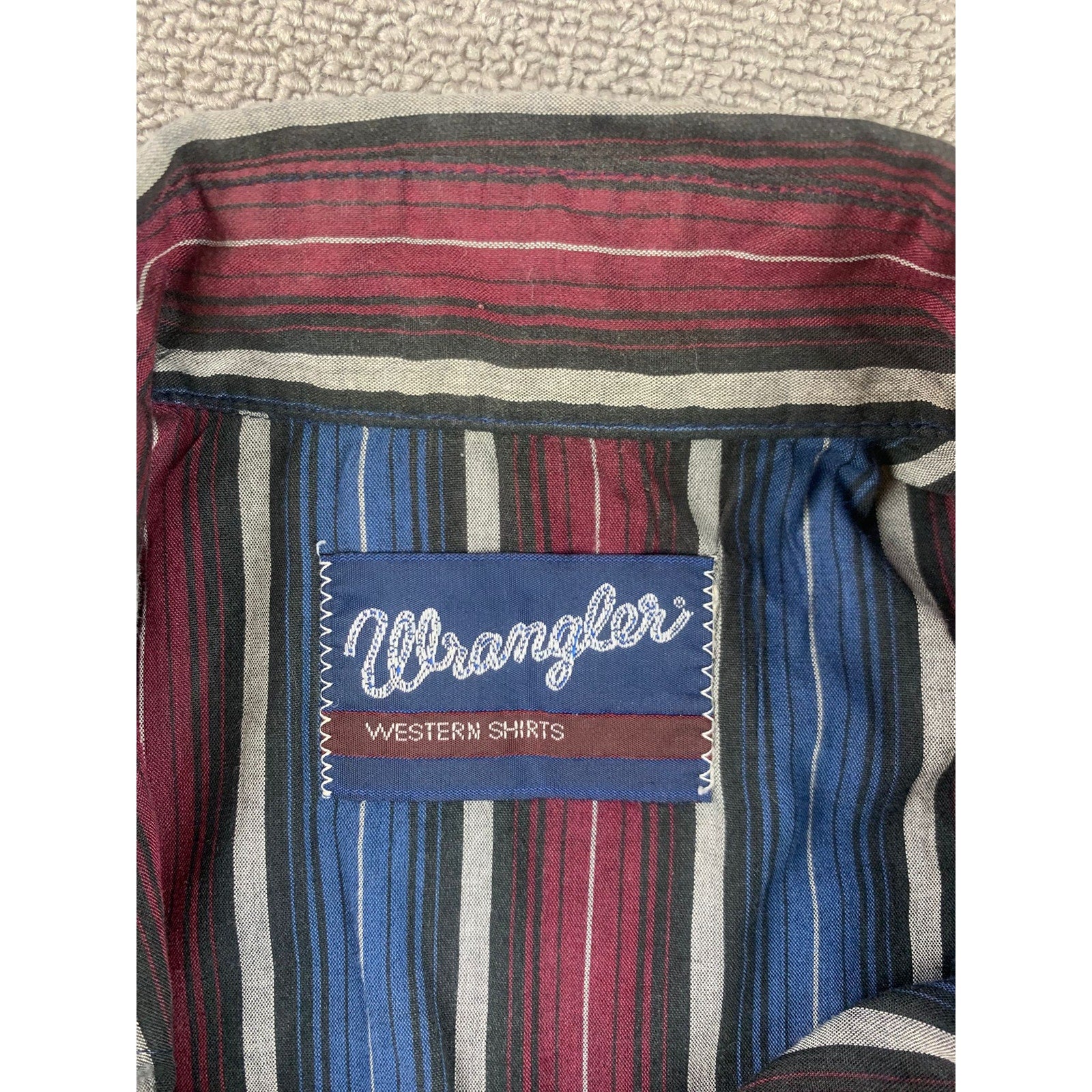 Classic Wrangler western short sleeve with pearl snaps, pointed yokes, dual flap pockets, and vertical multicolor stripes in burgundy blue black and gray; curved hem with extra-long tails. Novelty embroidered patches at front yokes add a unique touch.