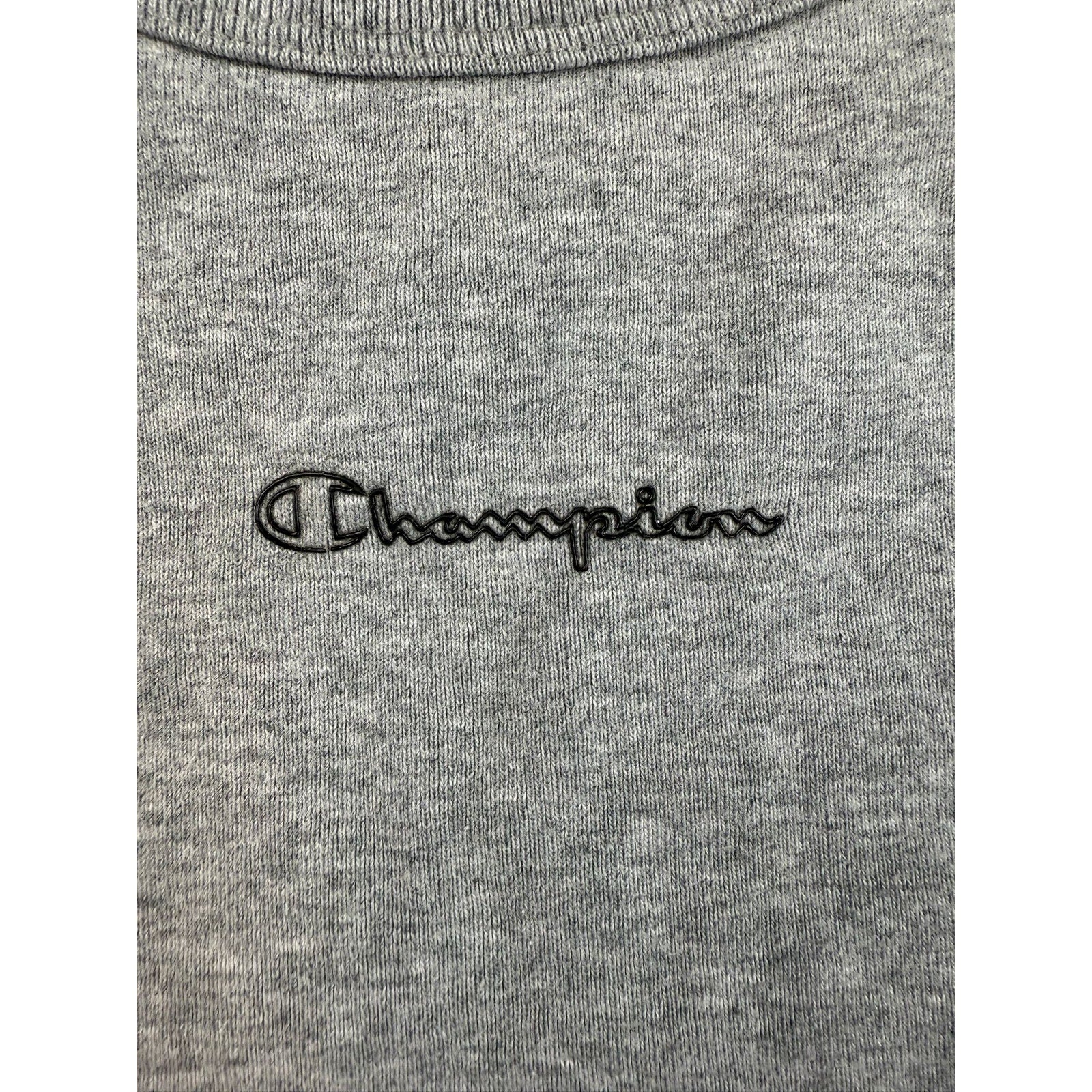 This is a classic grey Champion tank top. The ribbed shirt features a subtle, embroidered logo on the chest, making it perfect for a casual or athletic look.