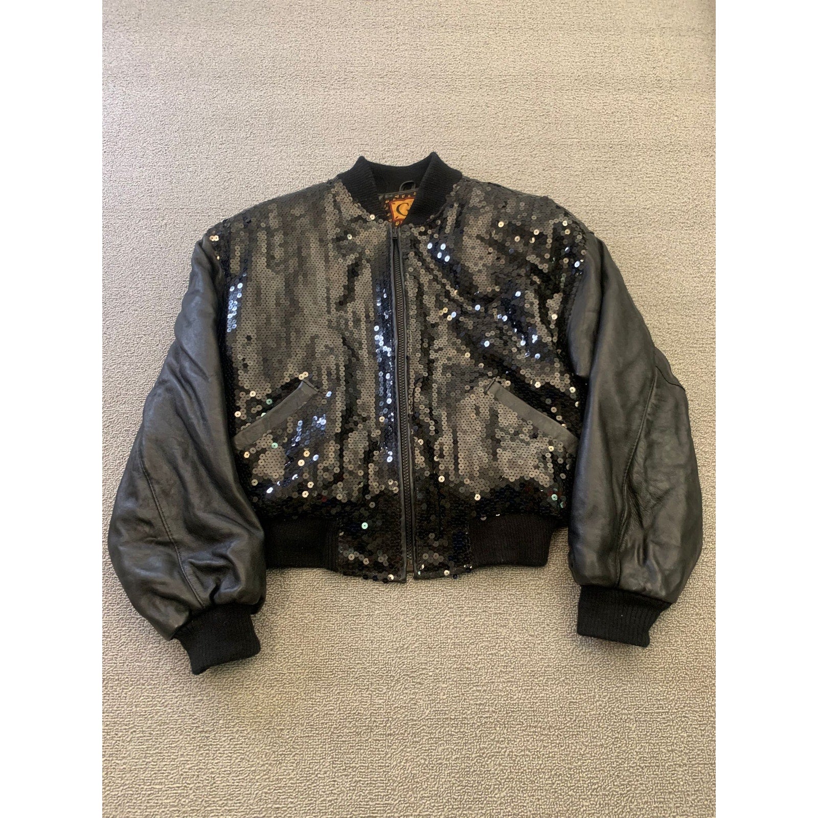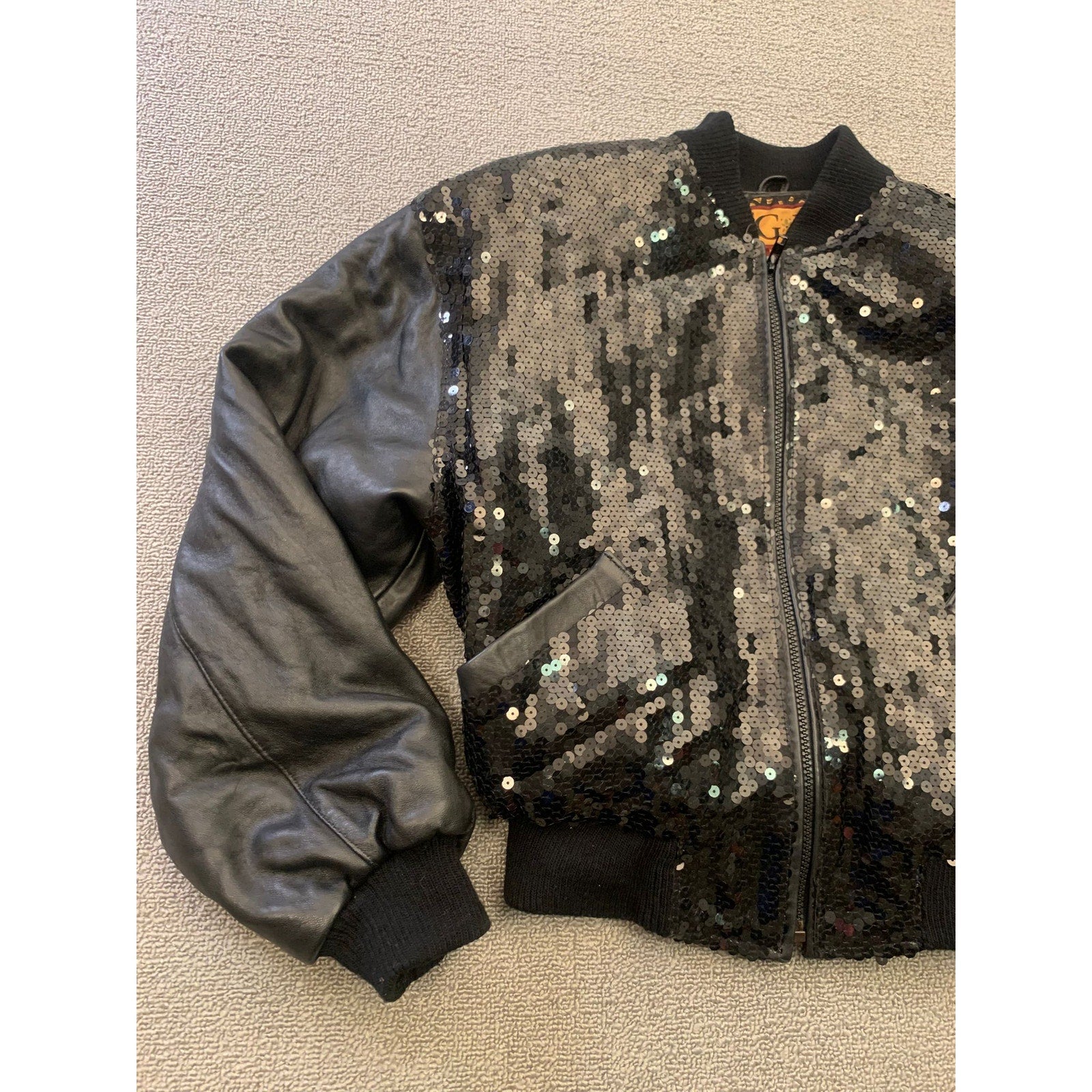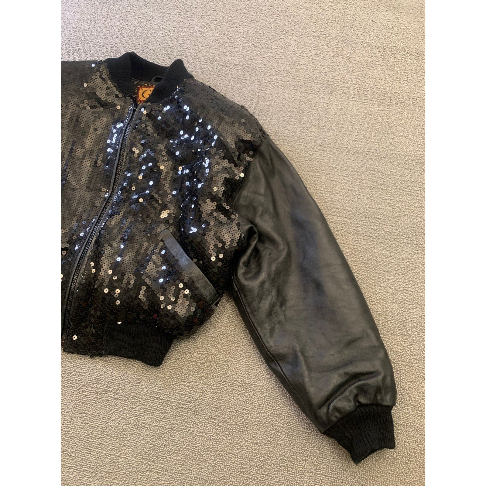 Edgy vintage-style bomber jacket with shimmering black sequin front panels and supple leather sleeves, plus a classic ribbed hem and cuffs. Statement-making with glamorous rock‑chic vibes.