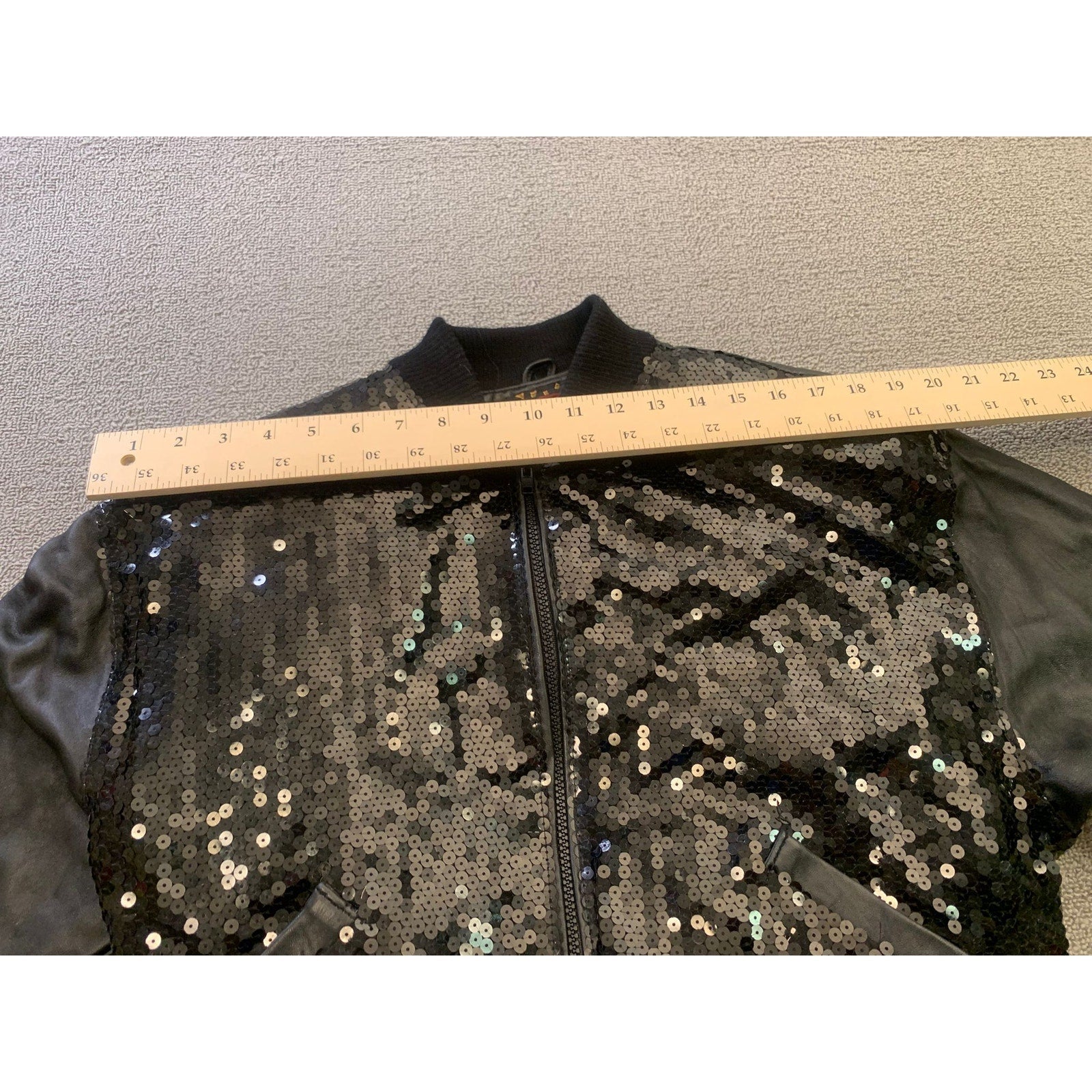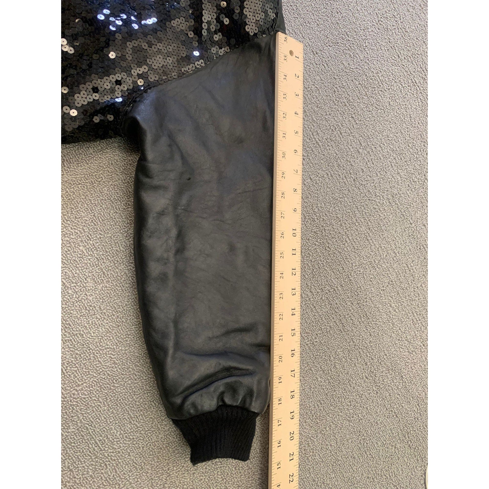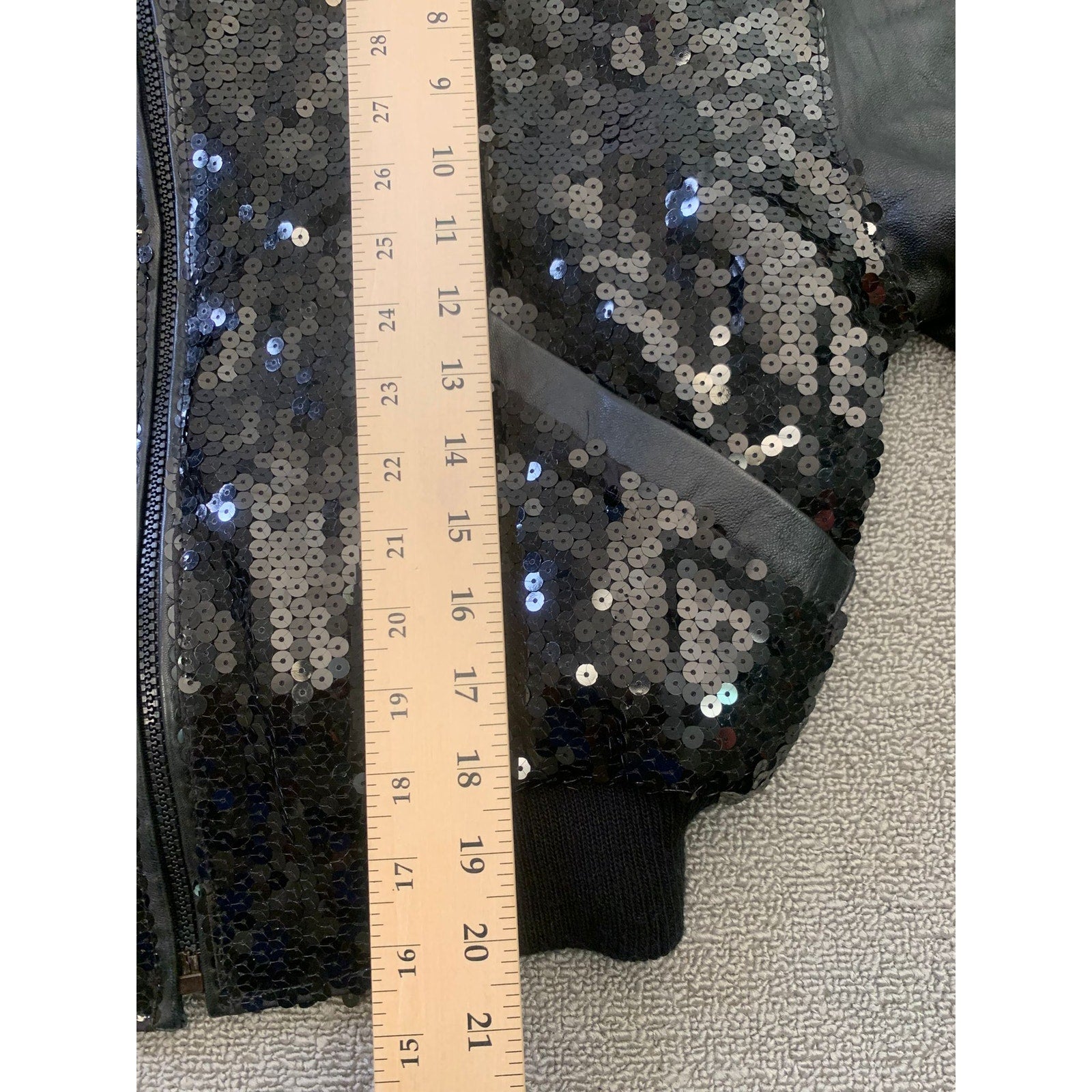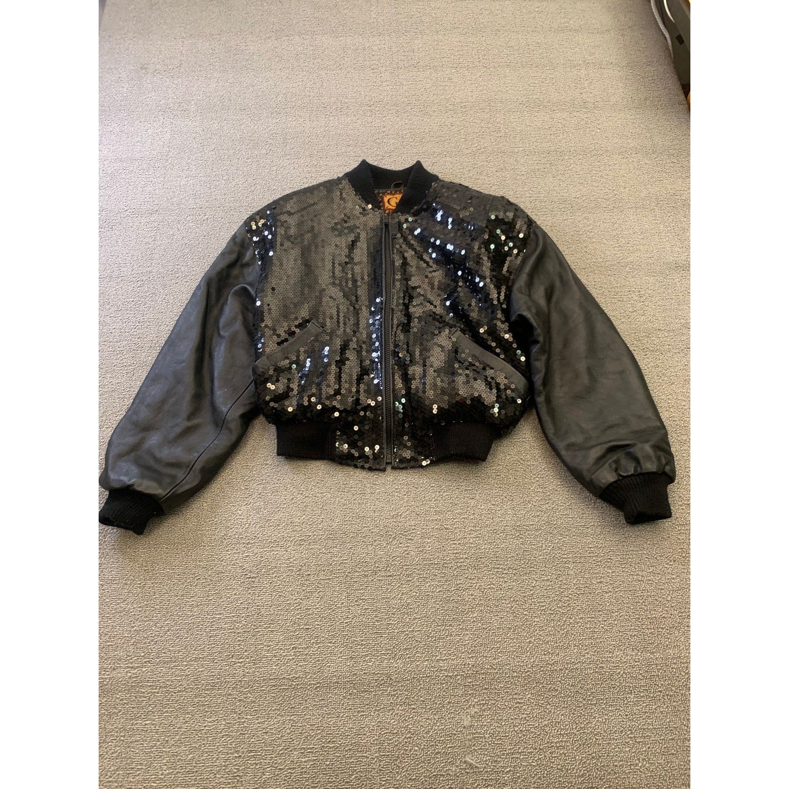 Edgy vintage-style bomber jacket with shimmering black sequin front panels and supple leather sleeves, plus a classic ribbed hem and cuffs. Statement-making with glamorous rock‑chic vibes.