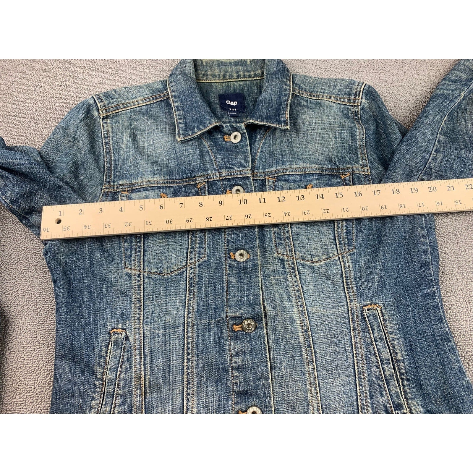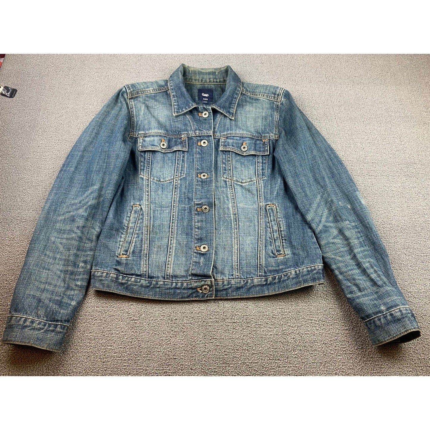 Classic straight-fit Gap denim jacket in a medium-blue wash featuring a button-front closure, chest flap pockets, and clean lines—an easy layering staple with timeless appeal.
