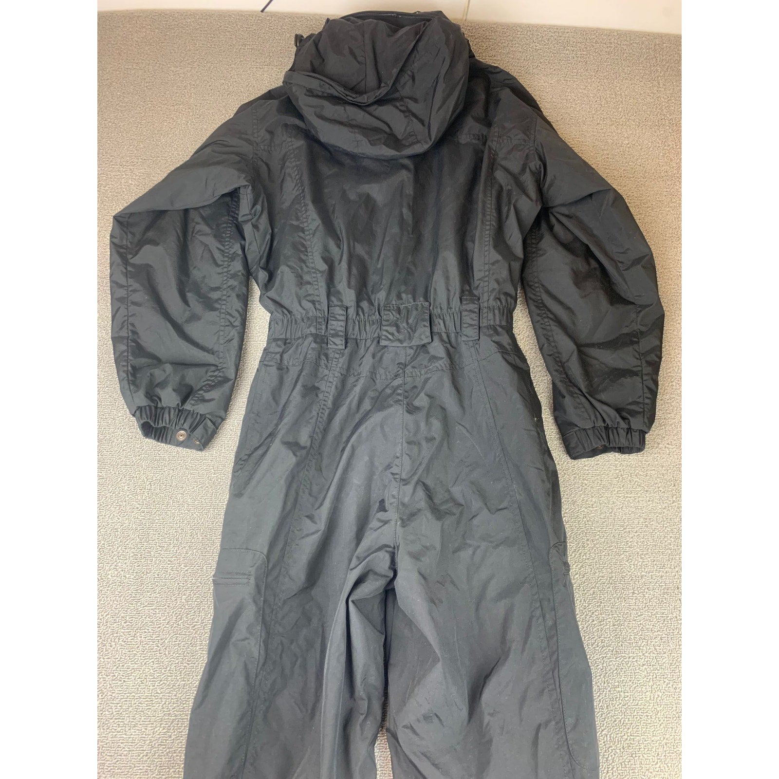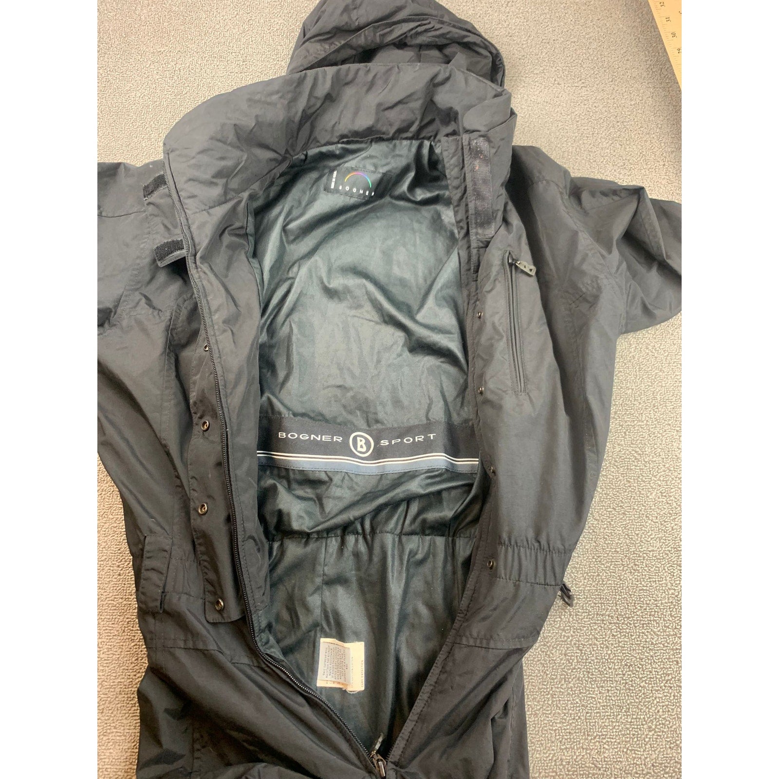 Bogner Women black one-piece ski snowsuit. Features full-length zip front with snap placket, multiple zip pockets, hood, elastic waist with adjustable straps, and zip ankles for easy boot access. Premium quality ski outerwear, designed for warmth and performance on the slopes