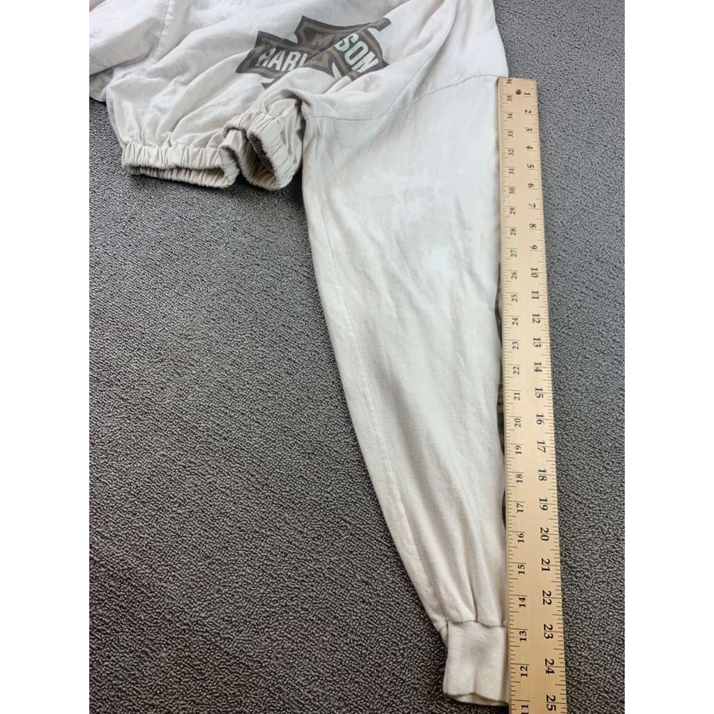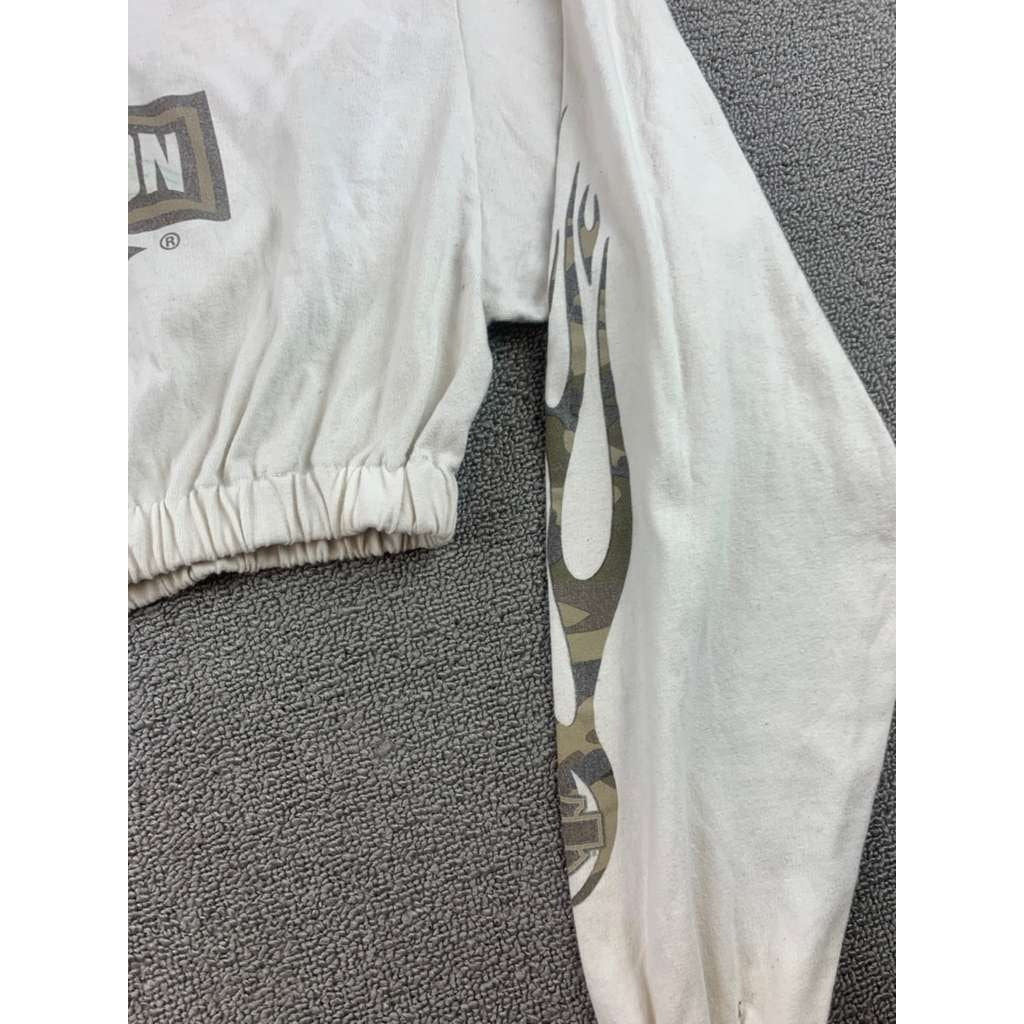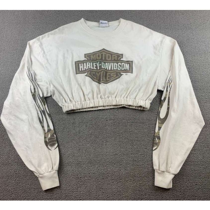 Reworked Harley-Davidson long sleeve tee with elastic cropped hem, camo flame sleeve hits, and large Bar & Shield front graphic. Licensed R.K. Stratman print on Hanes Beefy body—soft heavyweight cotton, crew neck, ribbed cuffs.