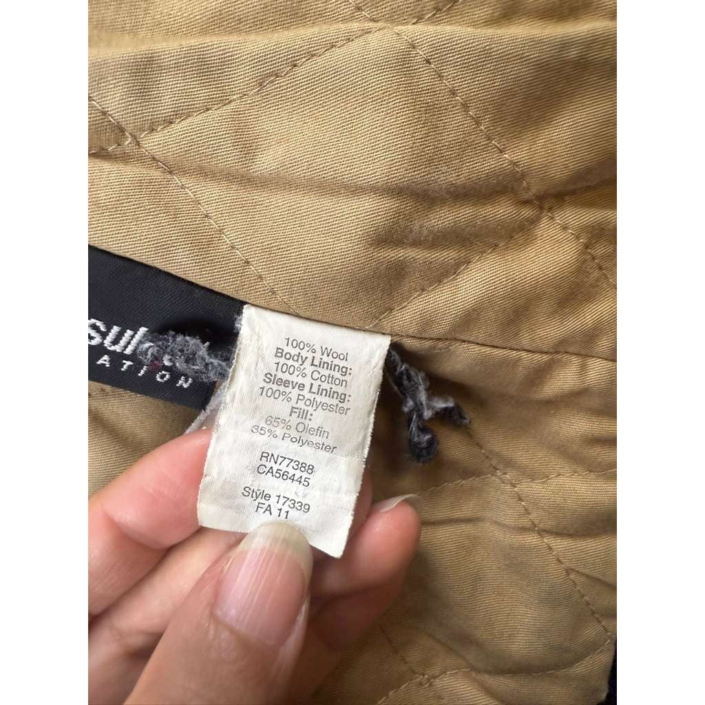 Classic military-inspired double-breasted peacoat with anchor buttons, handwarmer pockets and quilted lining. Black wool with tan quilted interior; timeless J.Crew “Bayswater” styling.