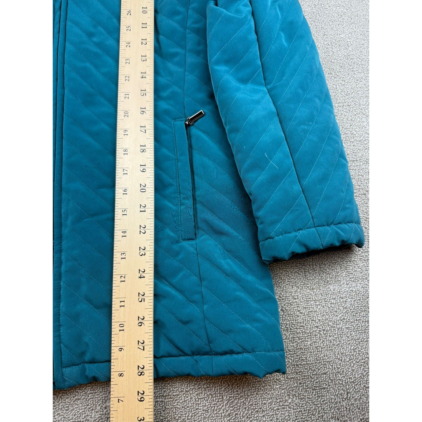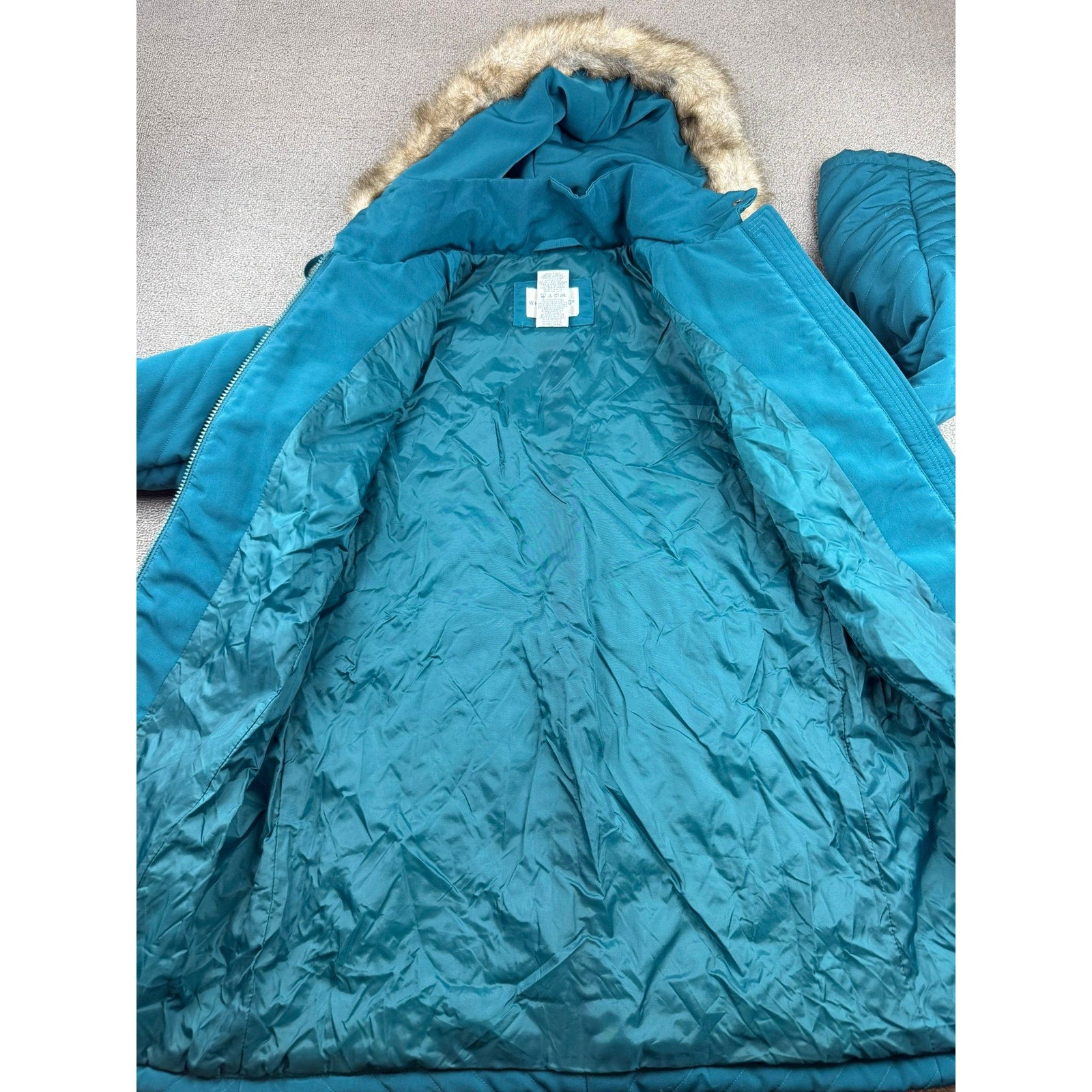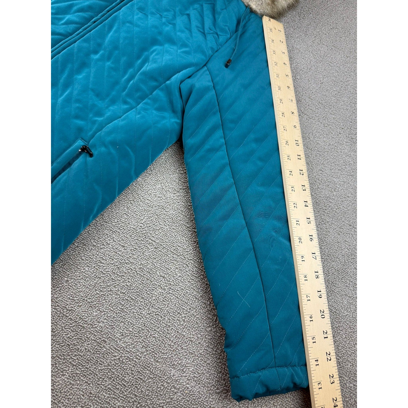 Stay warm in style with this White Stag women’s puffer coat in antique teal. Features a quilted design, full front zipper, detachable faux fur hood trim, and zippered side pockets. Perfect for cold weather and casual everyday wear.