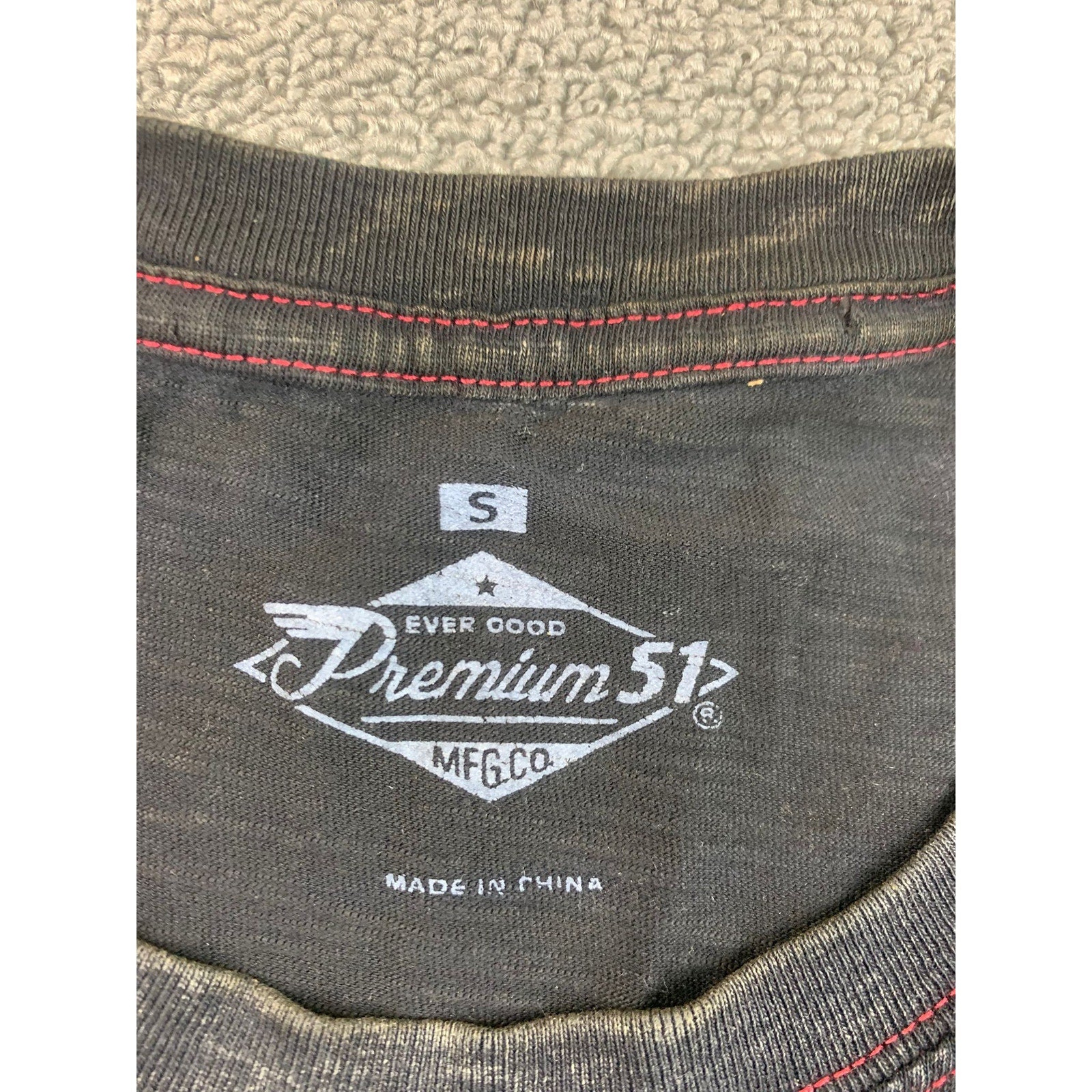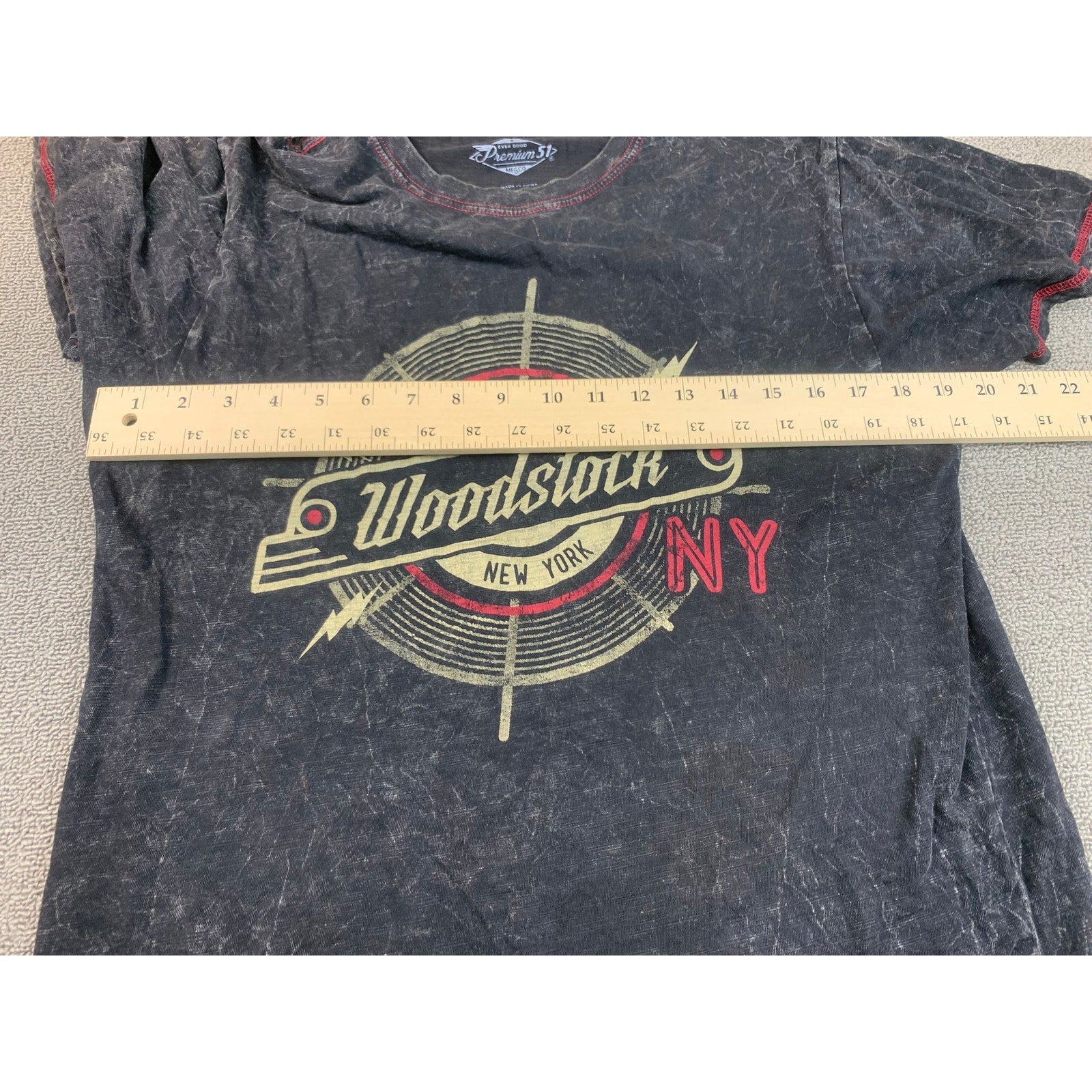 Every-day graphic tee by Premium 51, in black with red contrast stitching and a “Woodstock NY 1969” style design on front. Short sleeves, crew neck. Soft-worn cotton, gives that vintage look.
