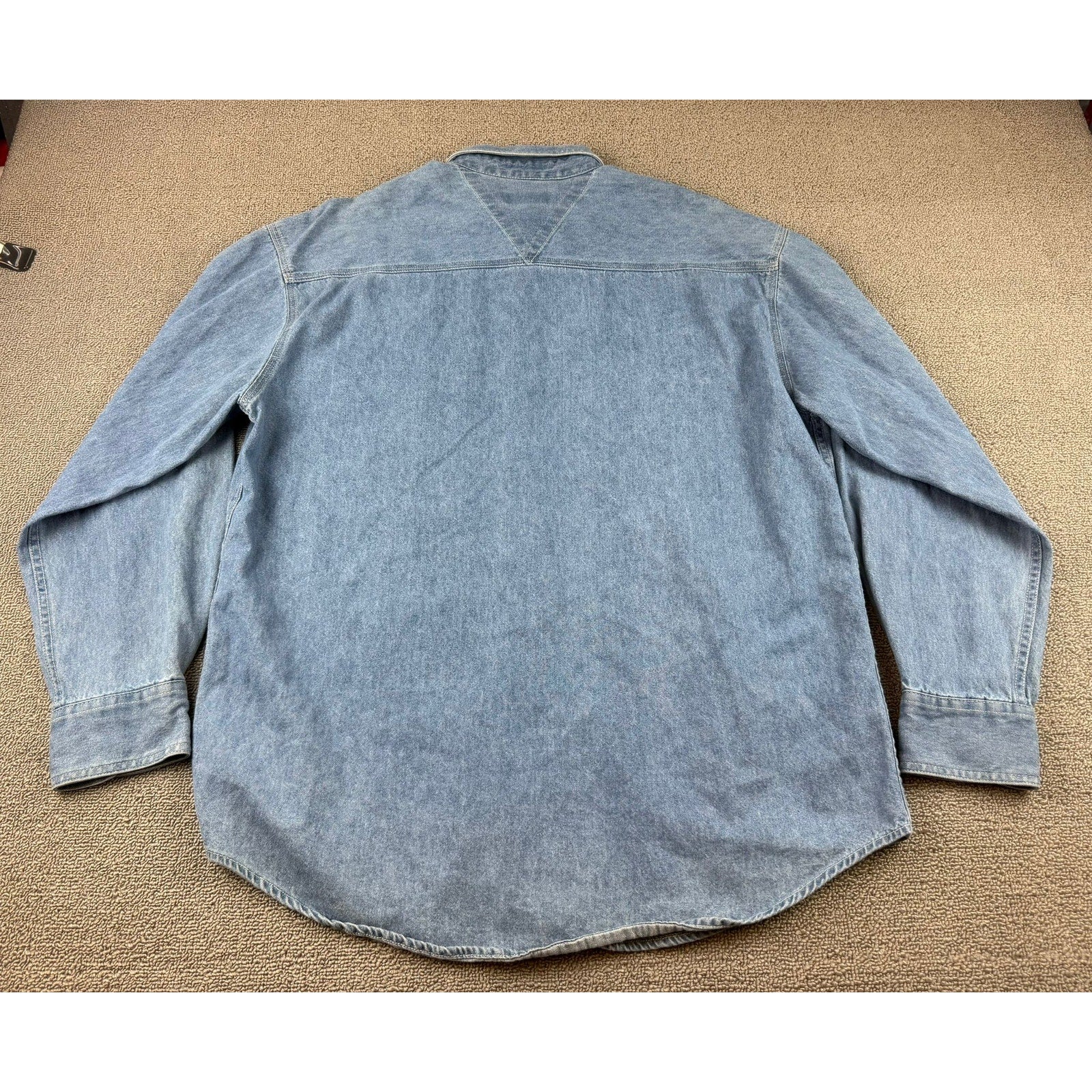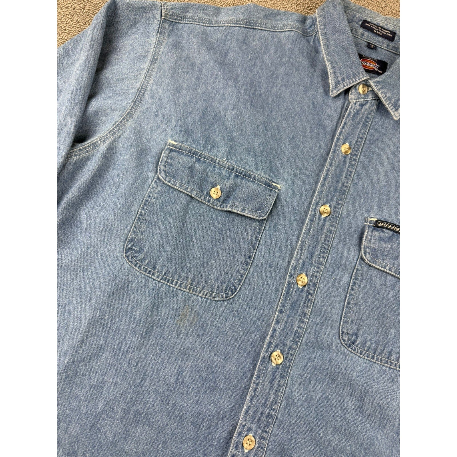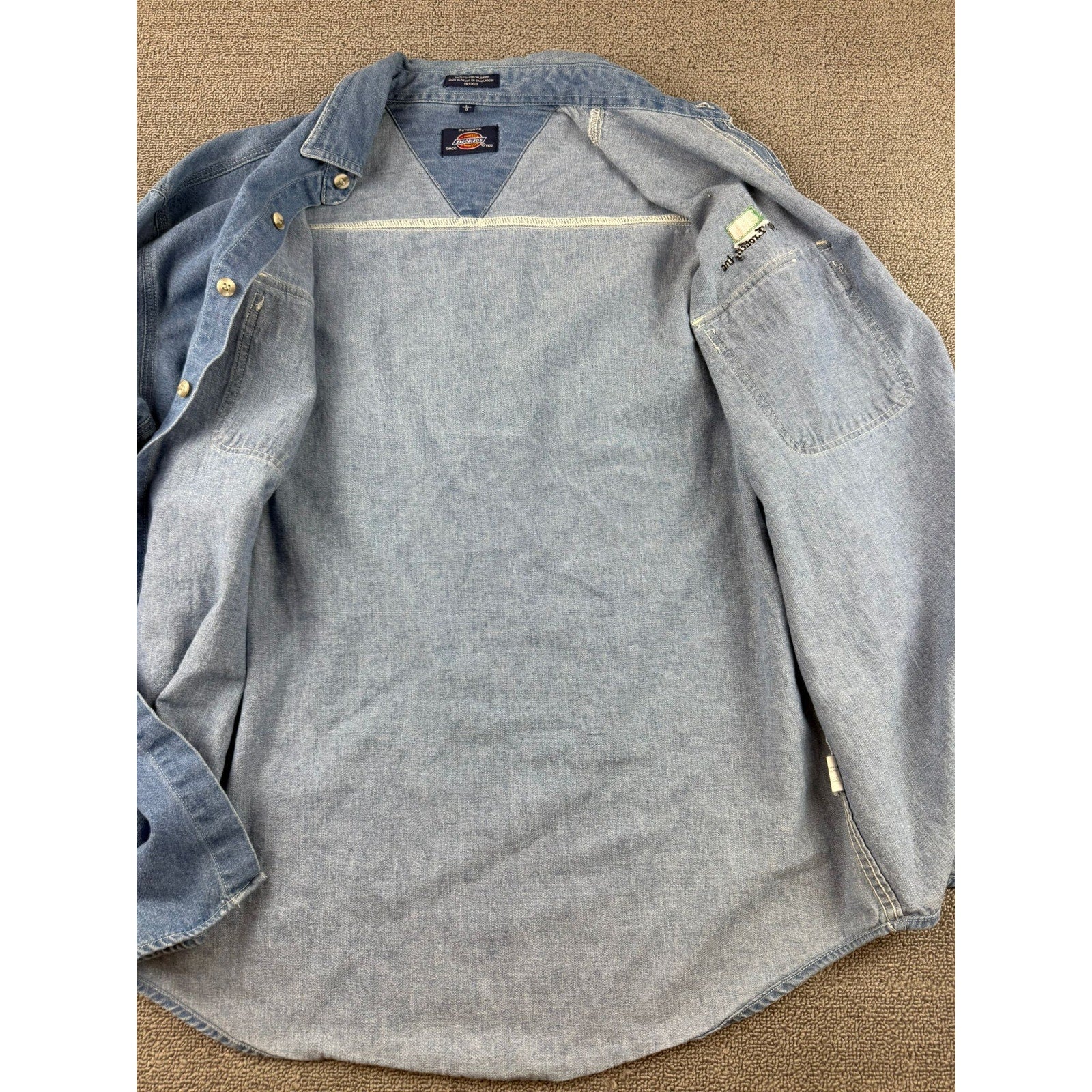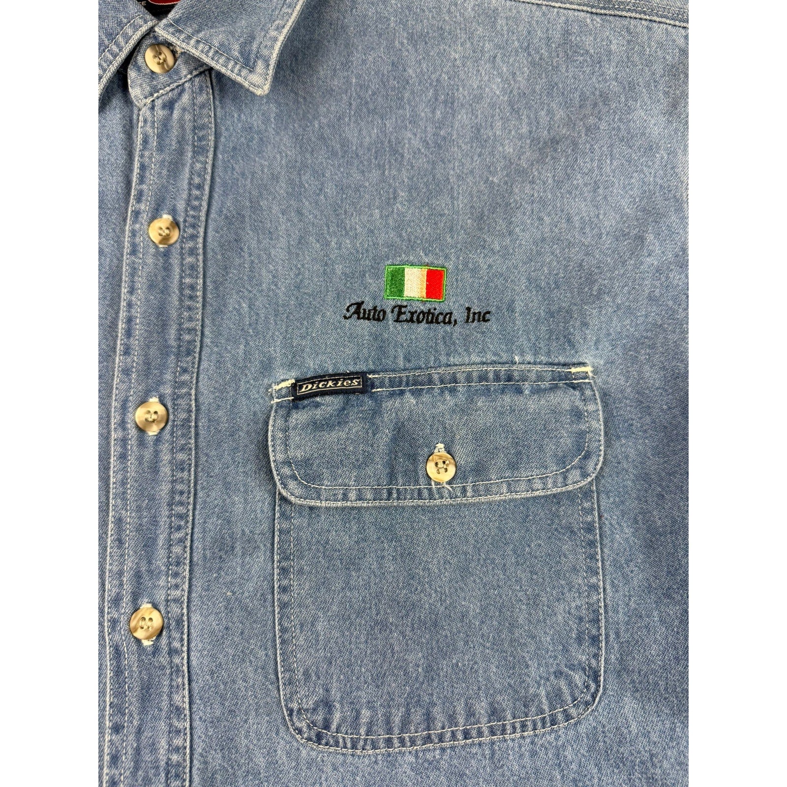 Y2K Dickies Denim Shirt Blue L Button Down Embroidered Auto Erotica Italy Flag