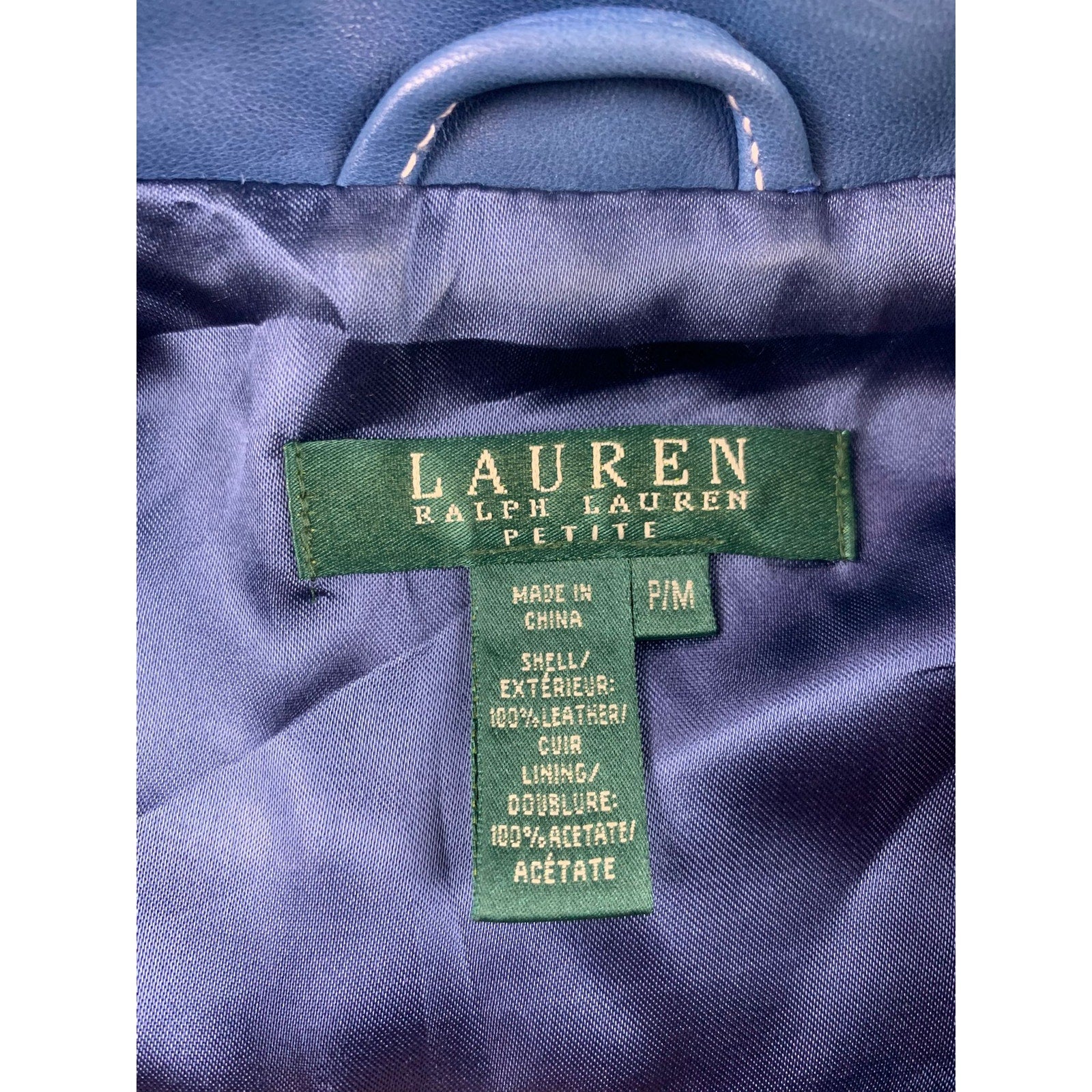 Classic Lauren Ralph Lauren petite leather trucker jacket in rich blue with contrast topstitching. Features snap-front closure, flap chest pockets, cropped hem, and full lining—clean, minimalist 1970s-inspired silhouette. Made in China, materials made of leather and acetate.