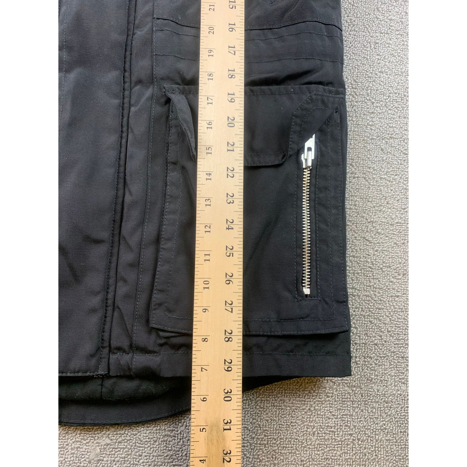 Designer parka in black with insulated lining and attached hood. Features heavy silver zippers at chest and lower pockets, storm placket over front zip, knit storm cuffs, fishtail style back hem, and multiple utility pockets. Modern street-military look. Made in China.