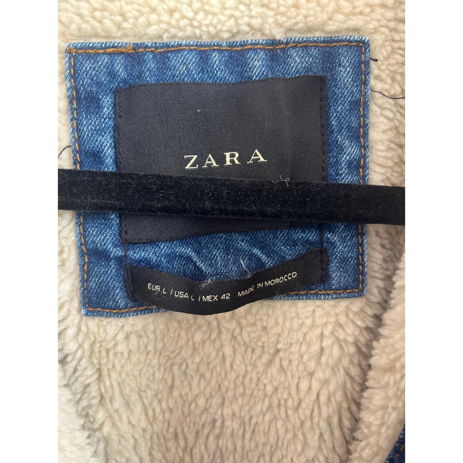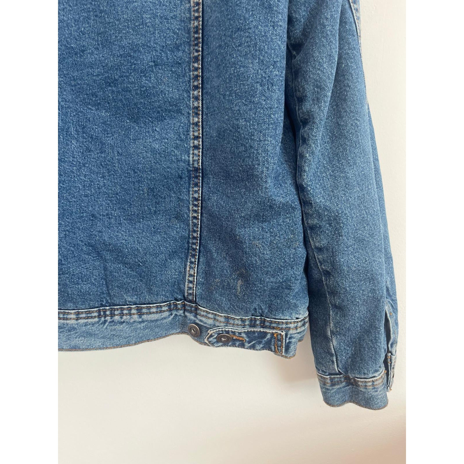 Classic trucker-style denim jacket by Zara featuring a blue wash, cream sherpa lining, and faux shearling collar. Full snap button closure with chest flap pockets and side welt pockets. Great for layering in fall or winter.