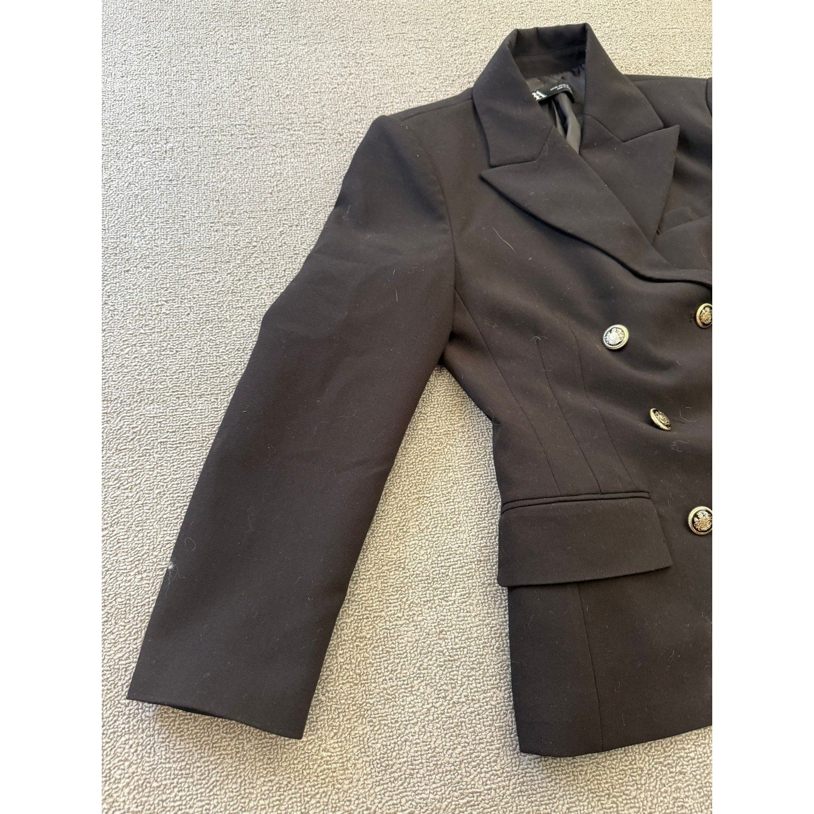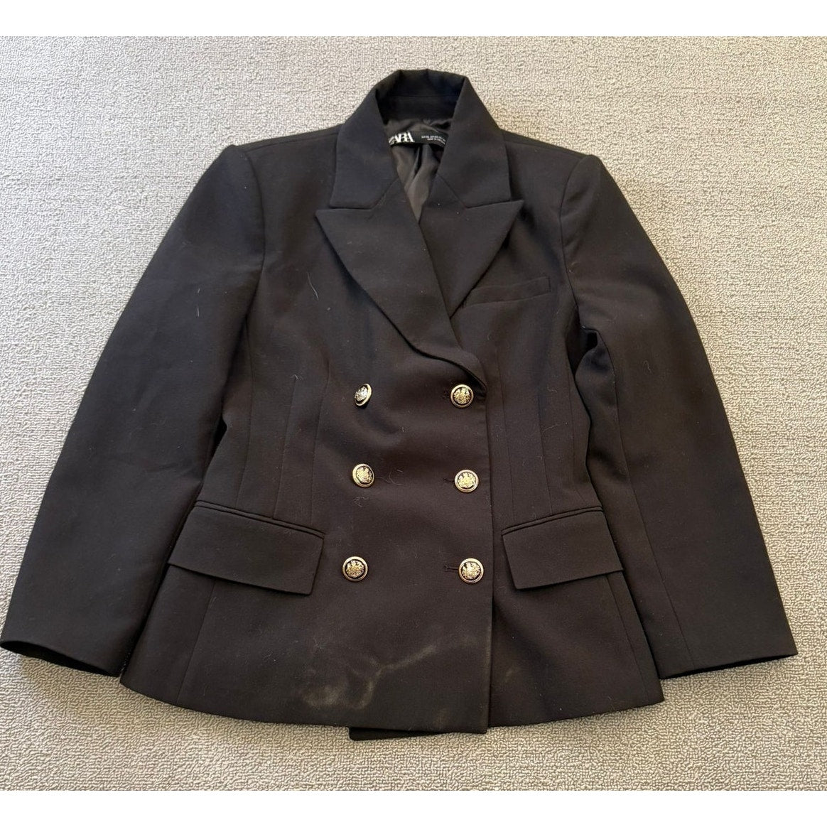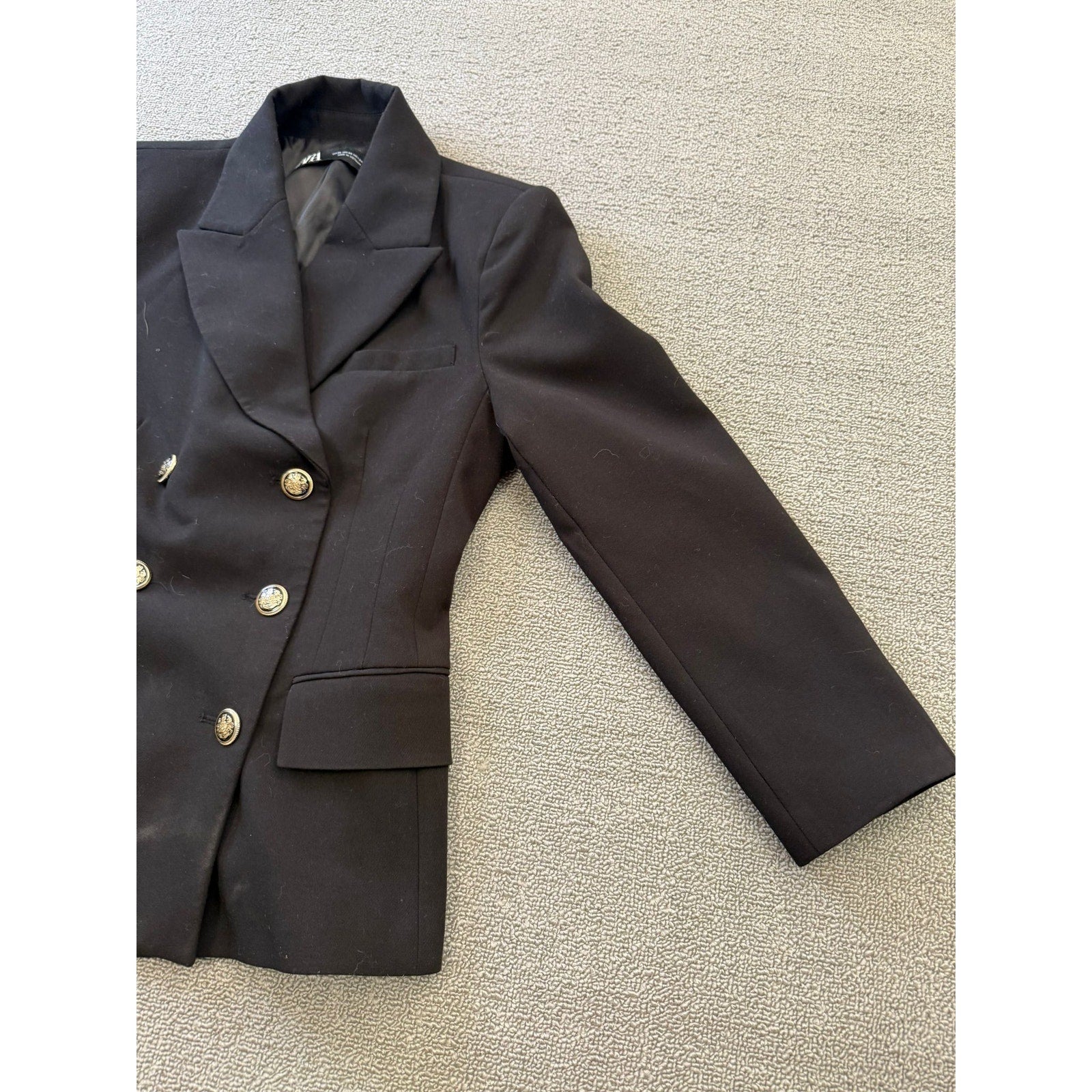 Tailored Zara blazer in classic black, featuring a refined double-breasted silhouette and polished gold-tone buttons—an elegant mix of modern minimalism and timeless tailoring. Structured fit with sharp shoulders and waist-definition, perfect for both professional and chic casual styling.