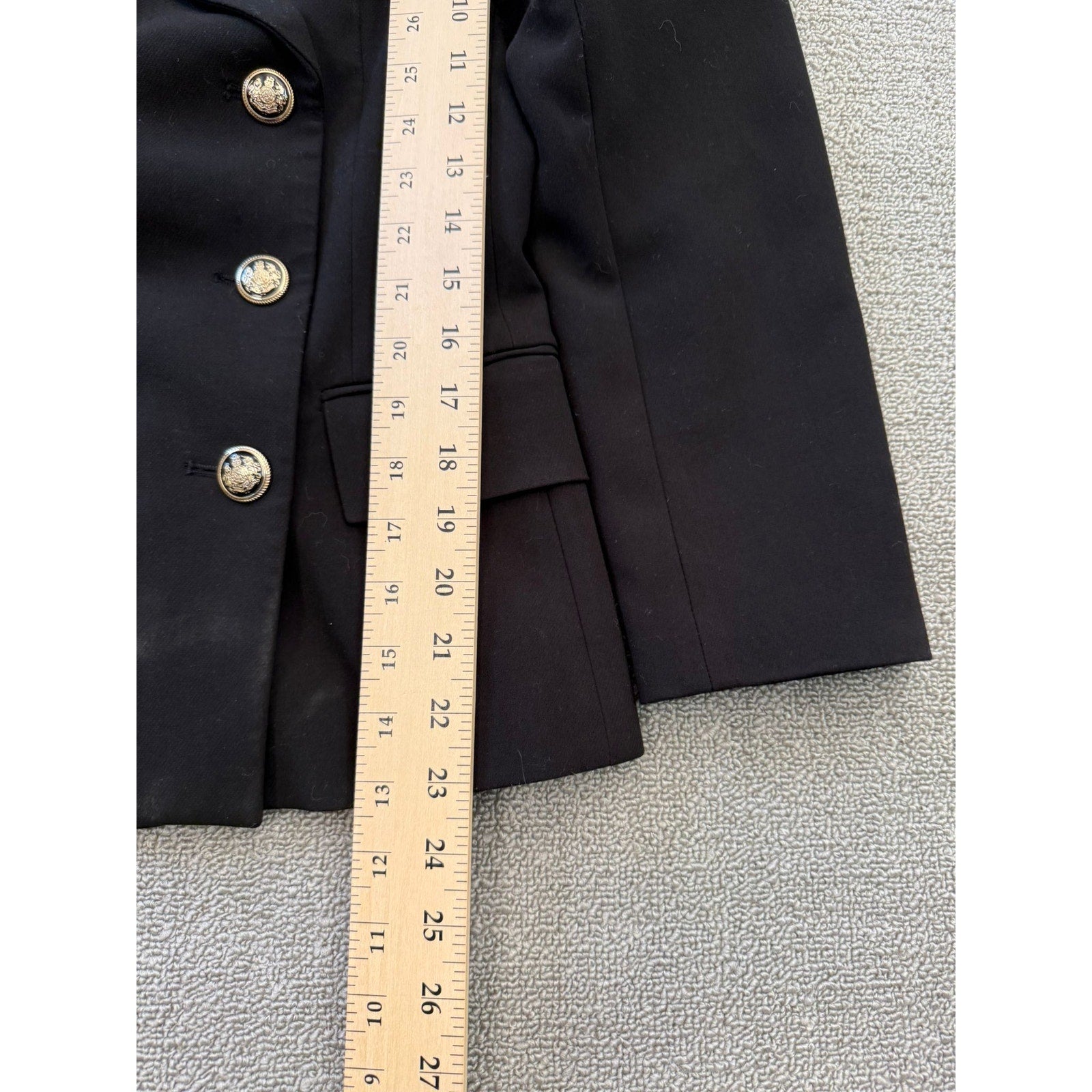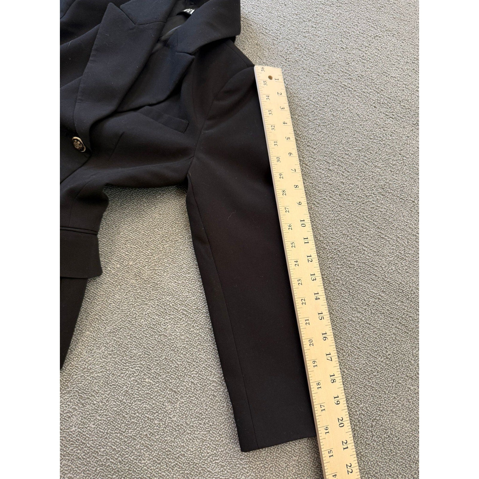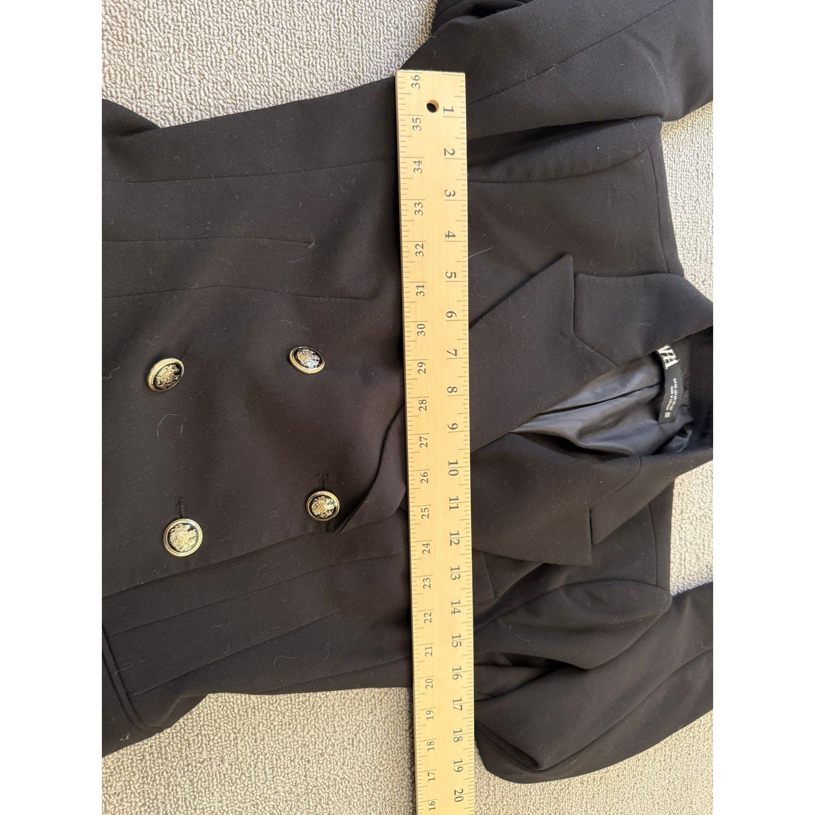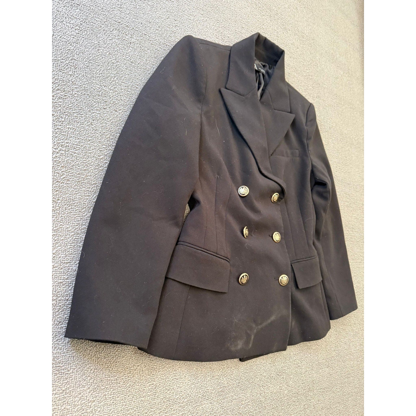 Tailored Zara blazer in classic black, featuring a refined double-breasted silhouette and polished gold-tone buttons—an elegant mix of modern minimalism and timeless tailoring. Structured fit with sharp shoulders and waist-definition, perfect for both professional and chic casual styling.
