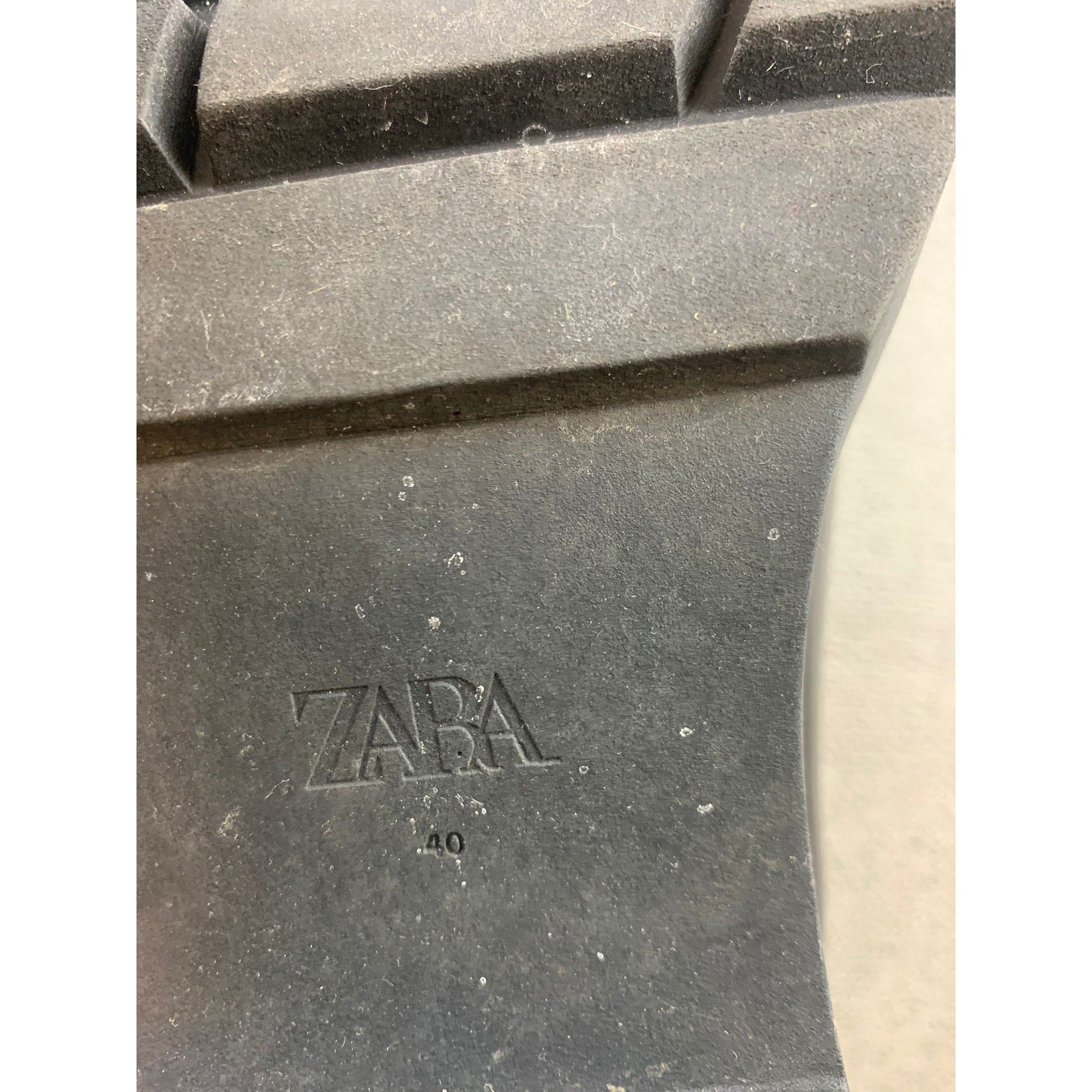 A pair of edgy Zara Chelsea-style platform boots in sleek black faux or genuine leather (please confirm material), featuring ribbed sock-style elastic panels at the ankle and a bold lug-sole platform for a modern, grunge-ready aesthetic. Despite some expected scuffs on the soles, the upper remains clean, the stitching intact, and the sole tread well-defined—ready to rock.