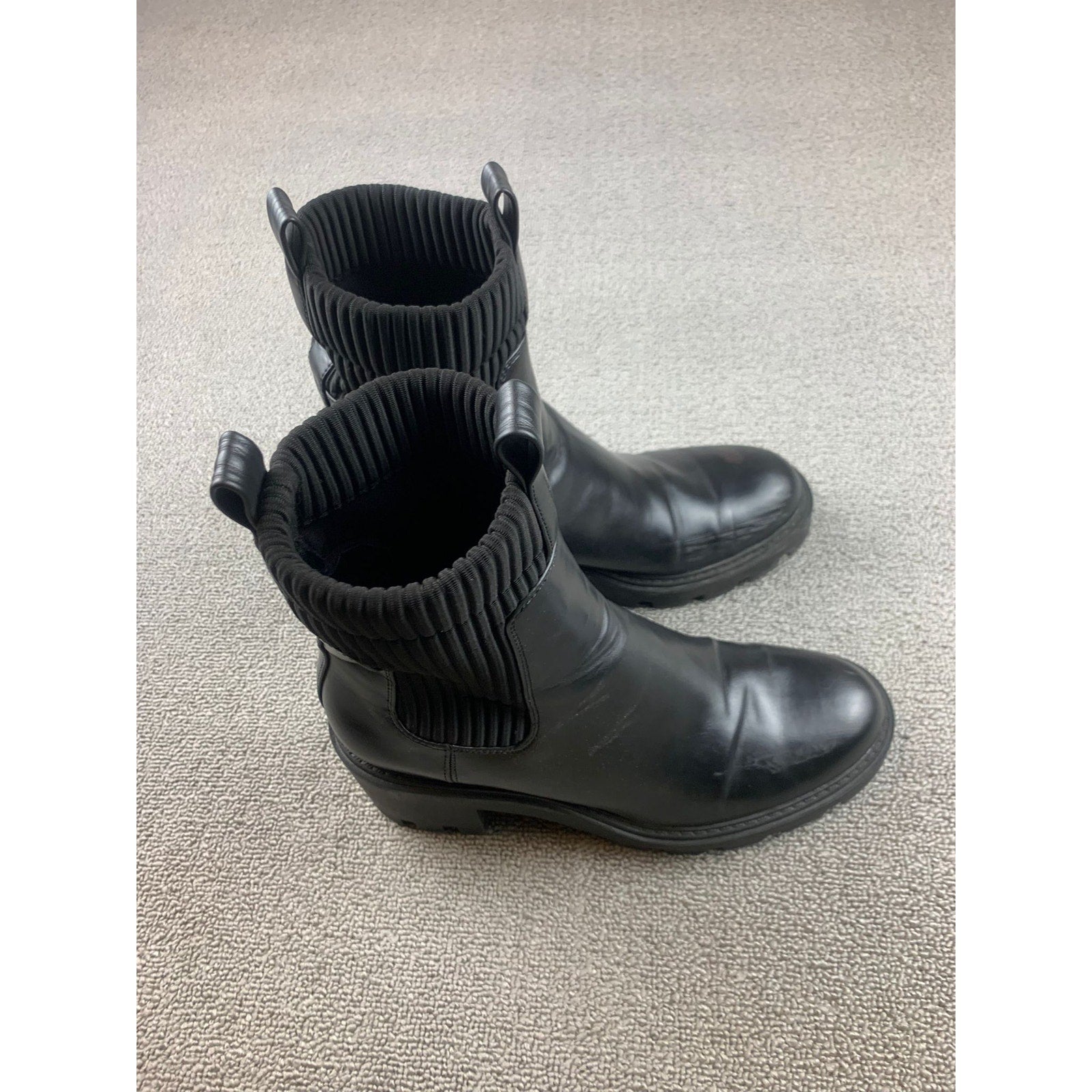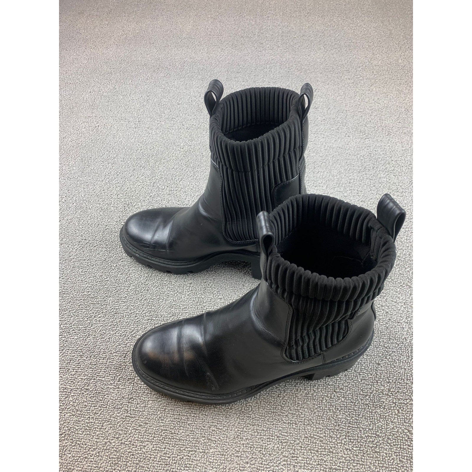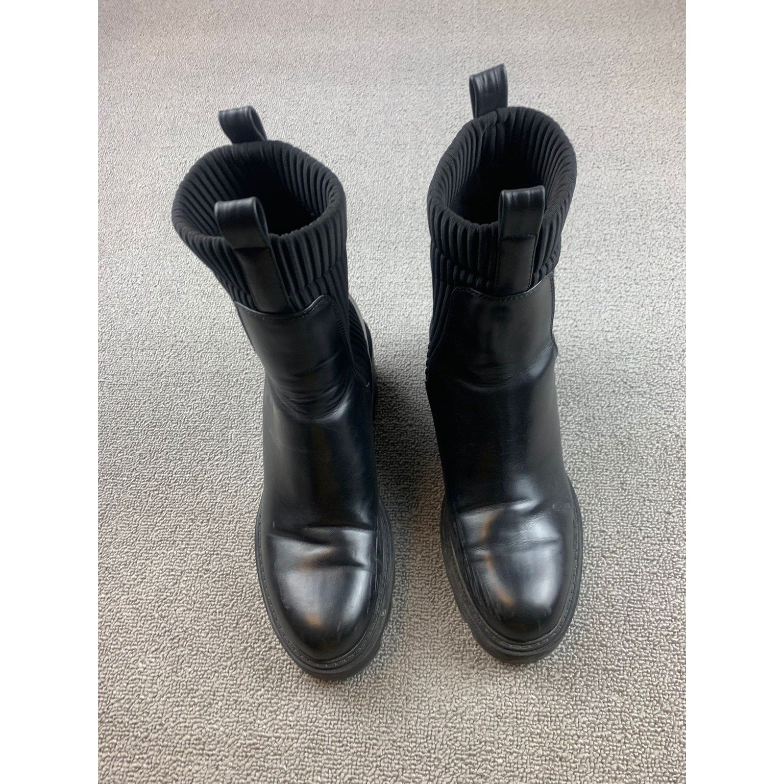 Zara Womens Sz 40 Black Faux Leather Chelsea Boots Lug Sole Ribbed Sock Mid Calf