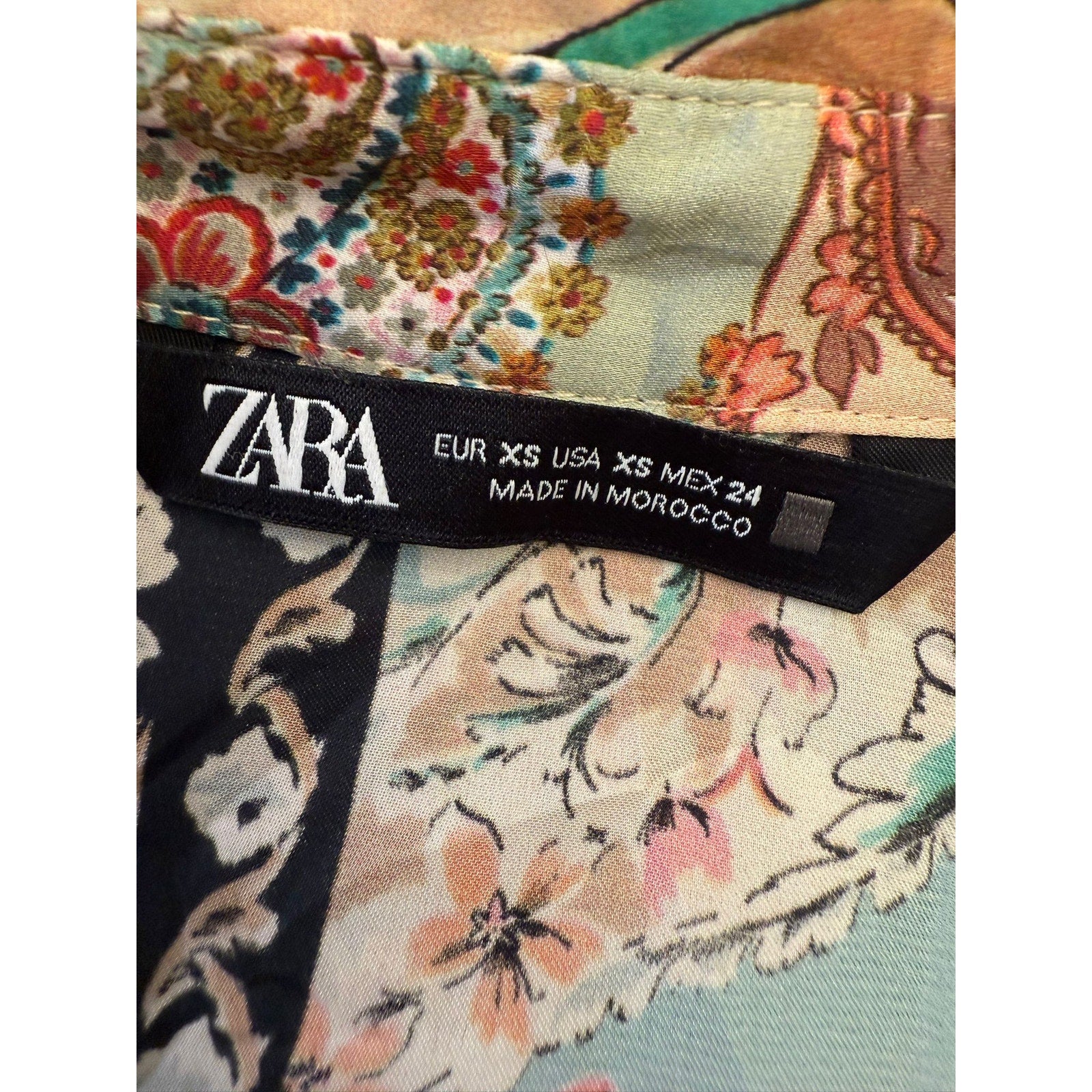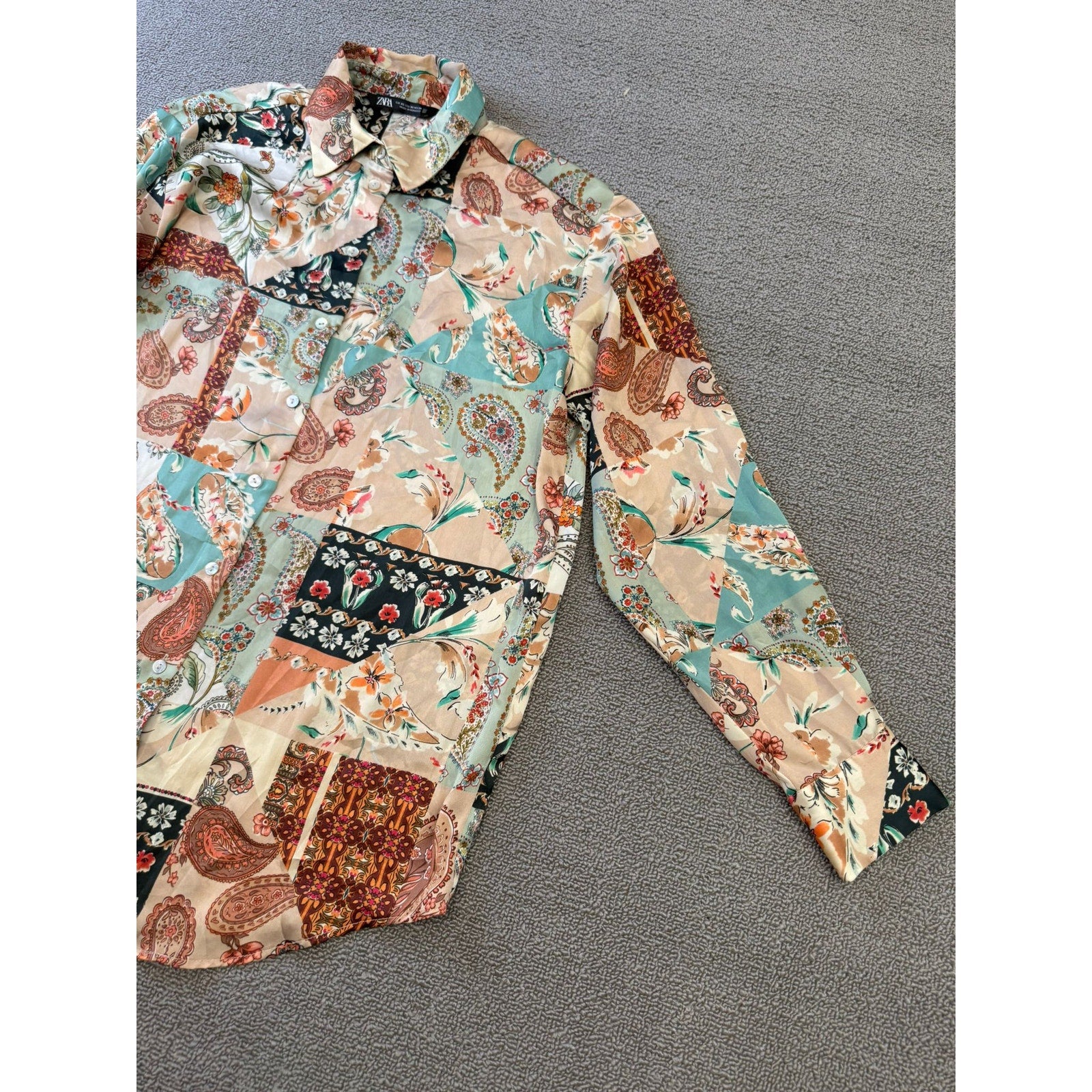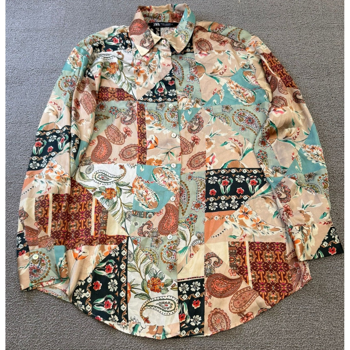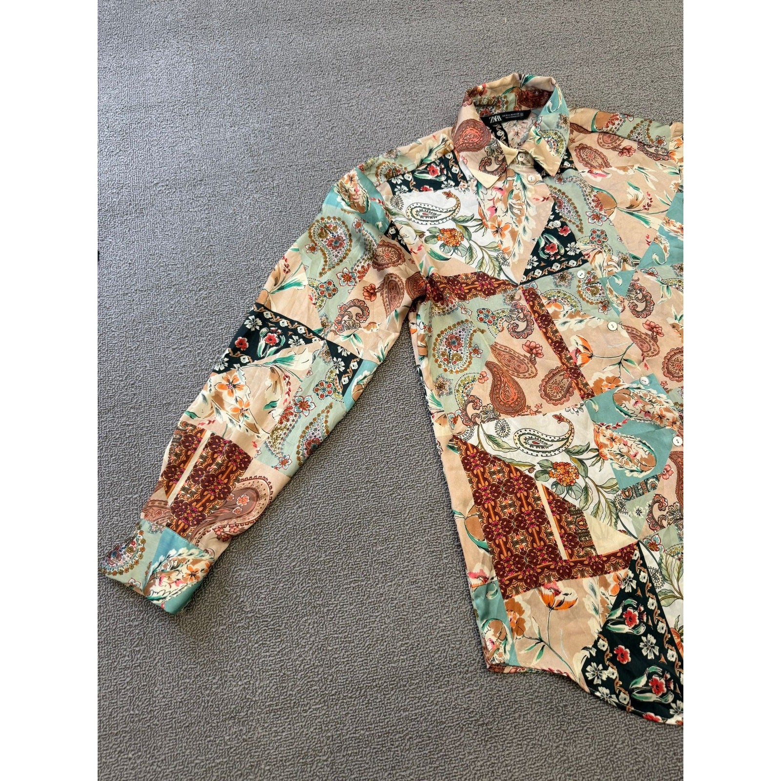 Chic Zara long‑sleeve button‑down shirt in boho satin affect paisley, blending soft pastels and warm neutrals in a flowing, lightweight silhouette—perfect for layering or wearing solo.