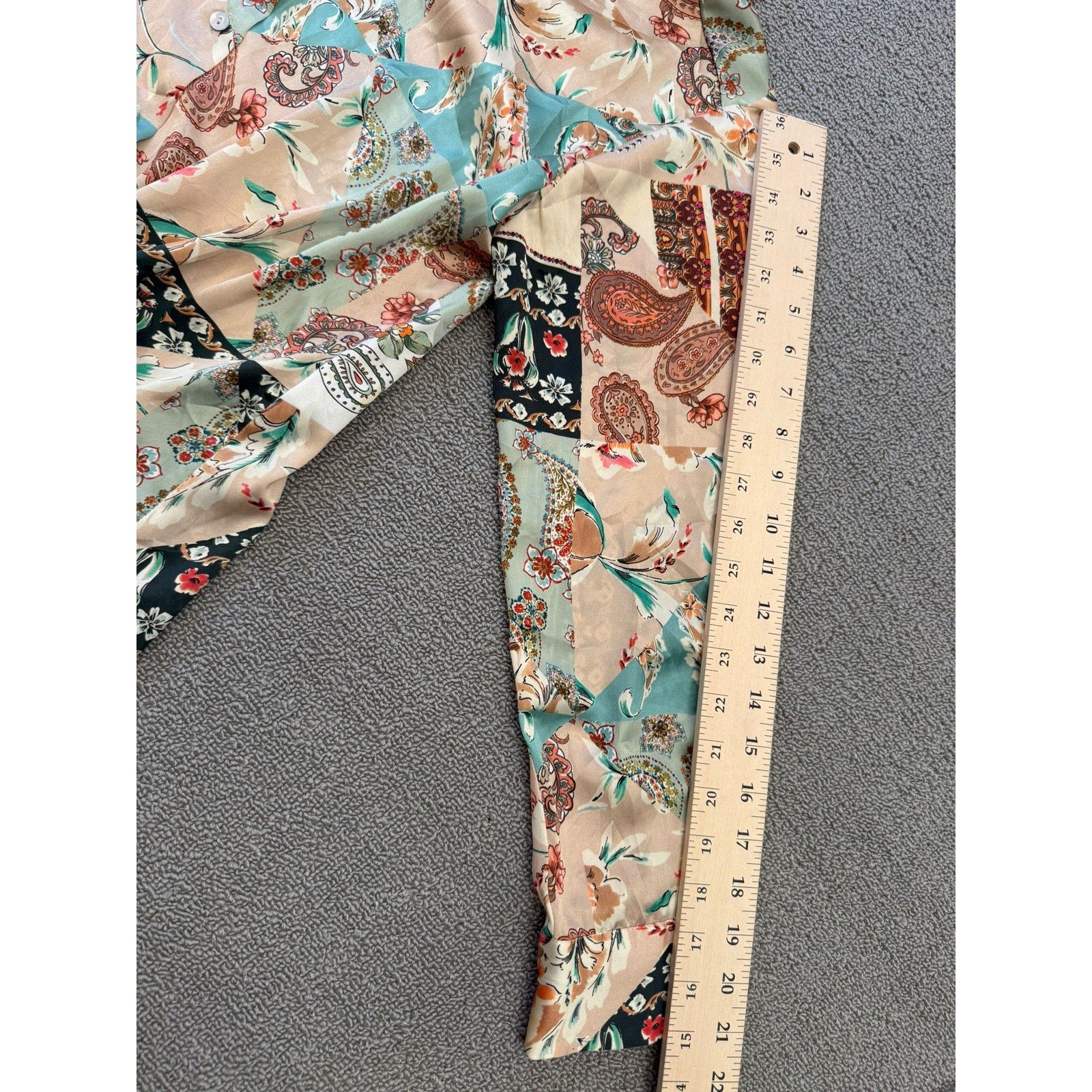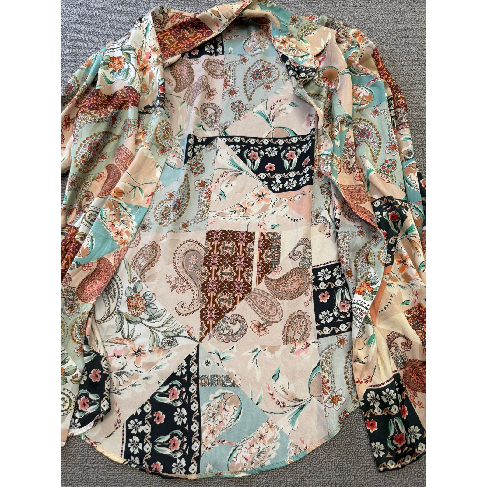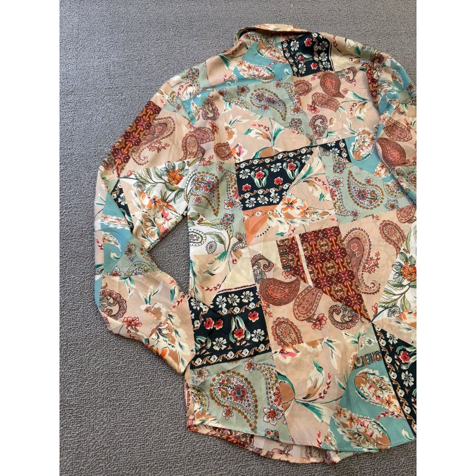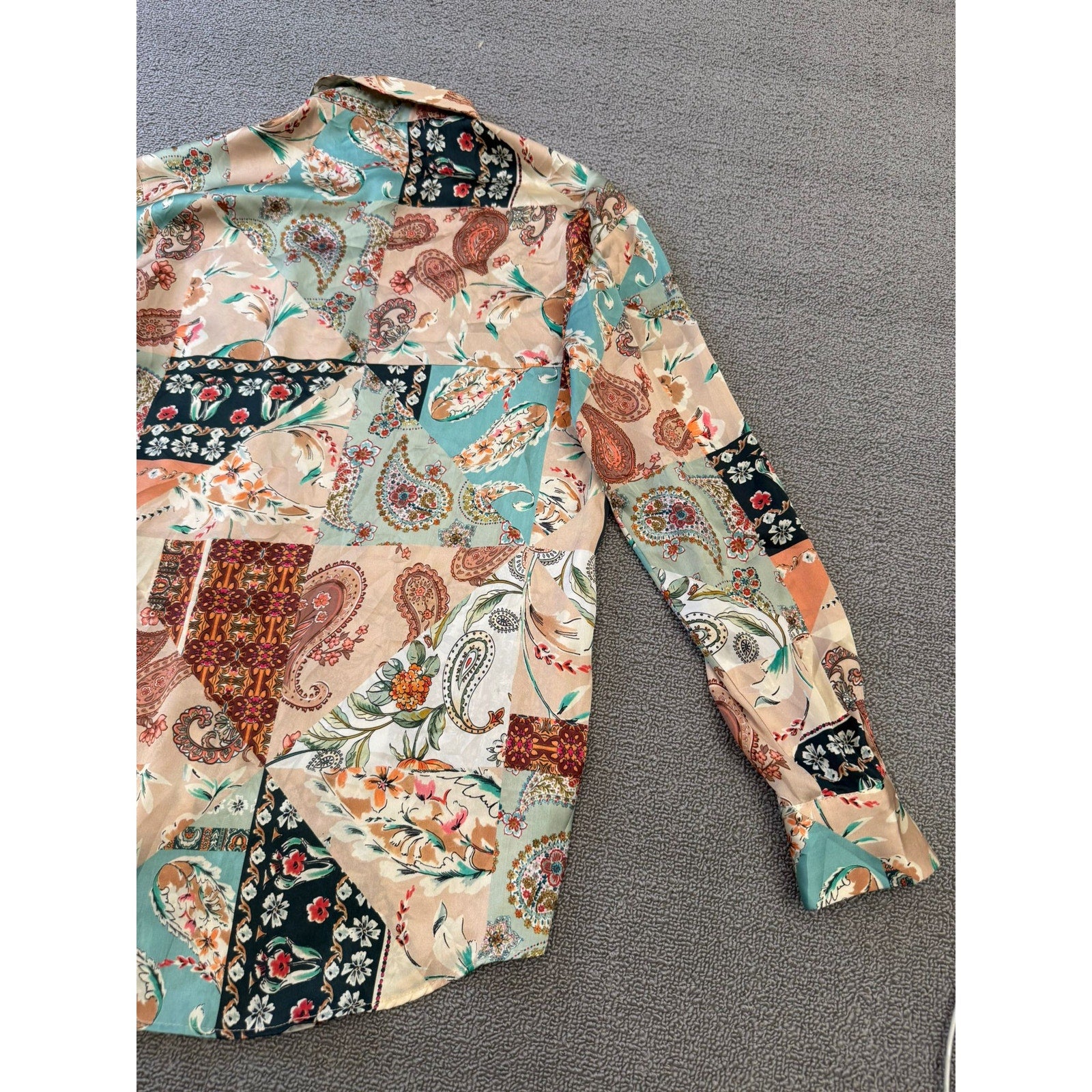 Chic Zara long‑sleeve button‑down shirt in boho satin affect paisley, blending soft pastels and warm neutrals in a flowing, lightweight silhouette—perfect for layering or wearing solo.