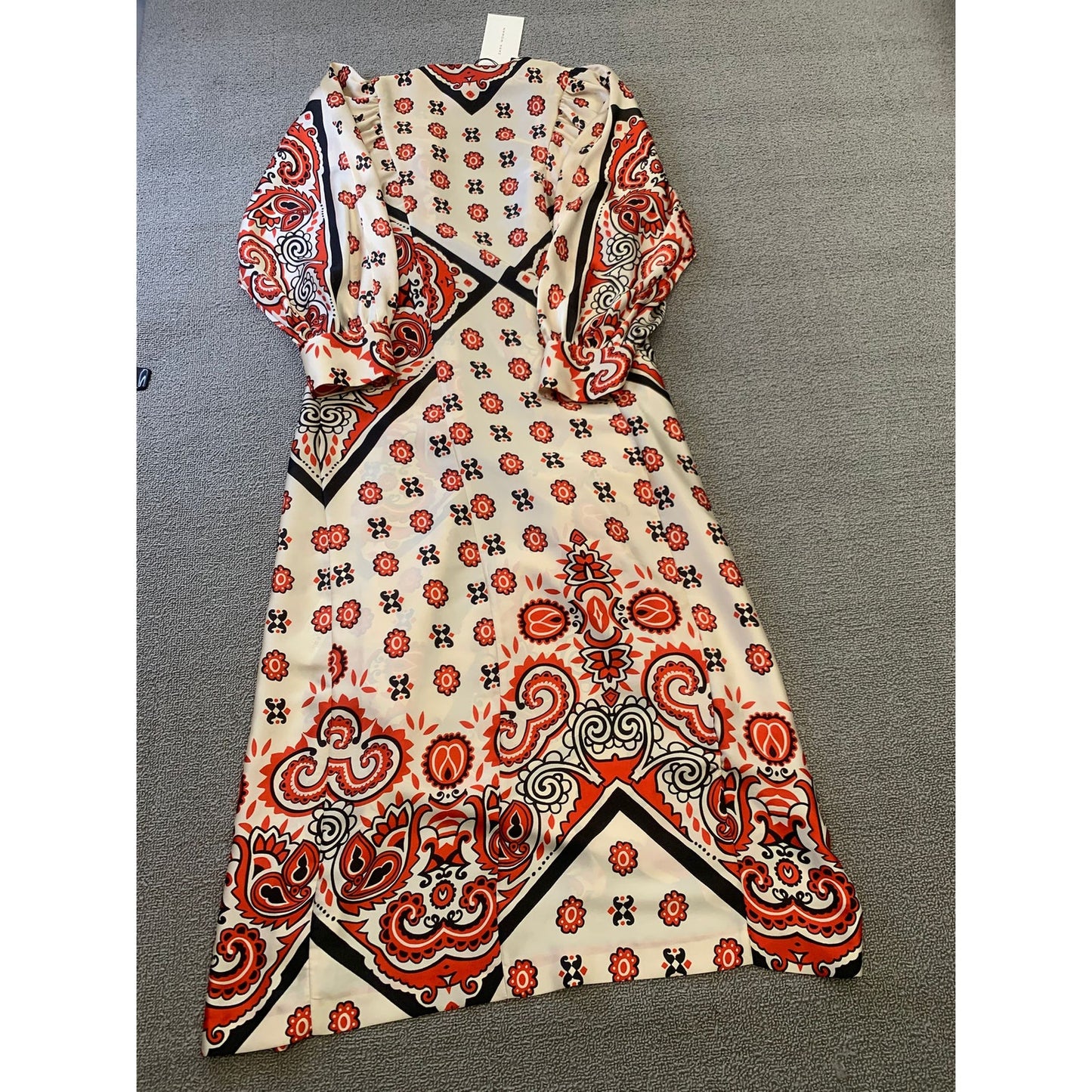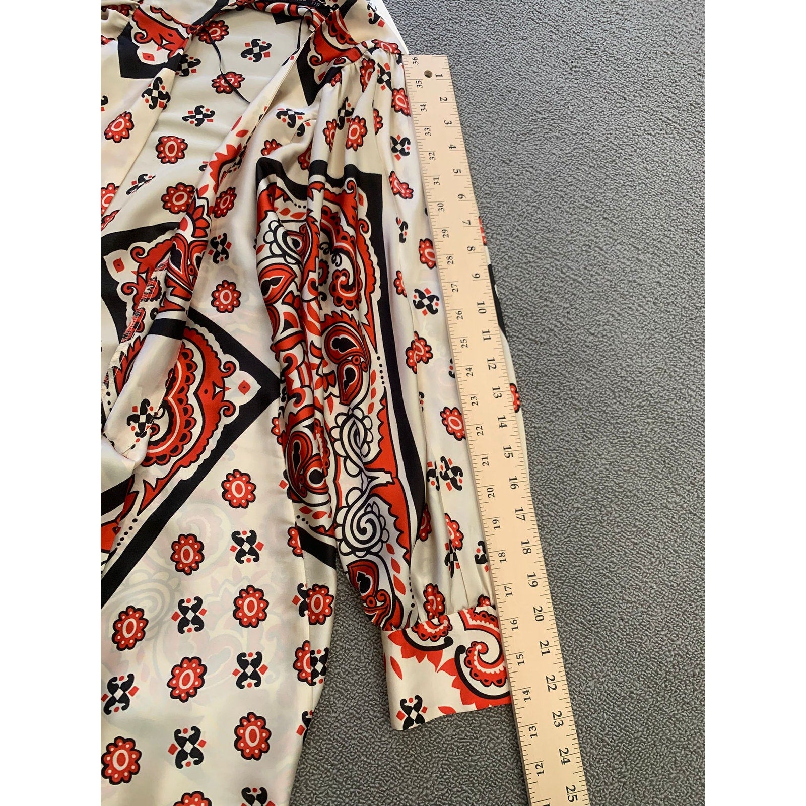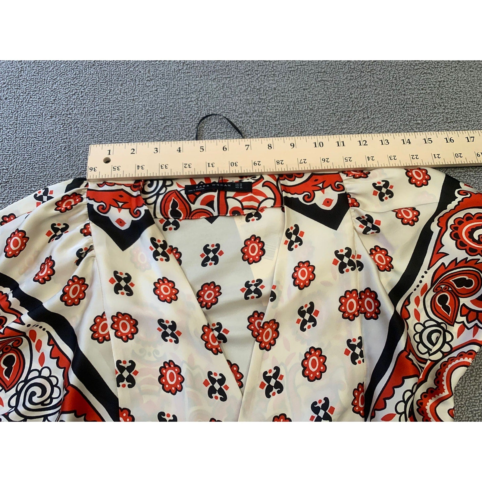 Lightweight wrap‐style midi dress from Zara Woman featuring a bold red, black, and white paisley and floral print, with long sleeves and a self‐tie waist for adjustable fit—flowy and elegant.