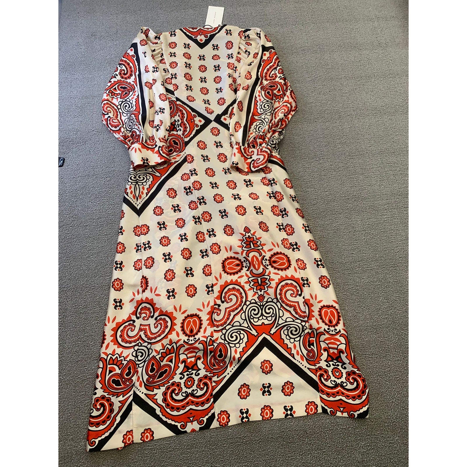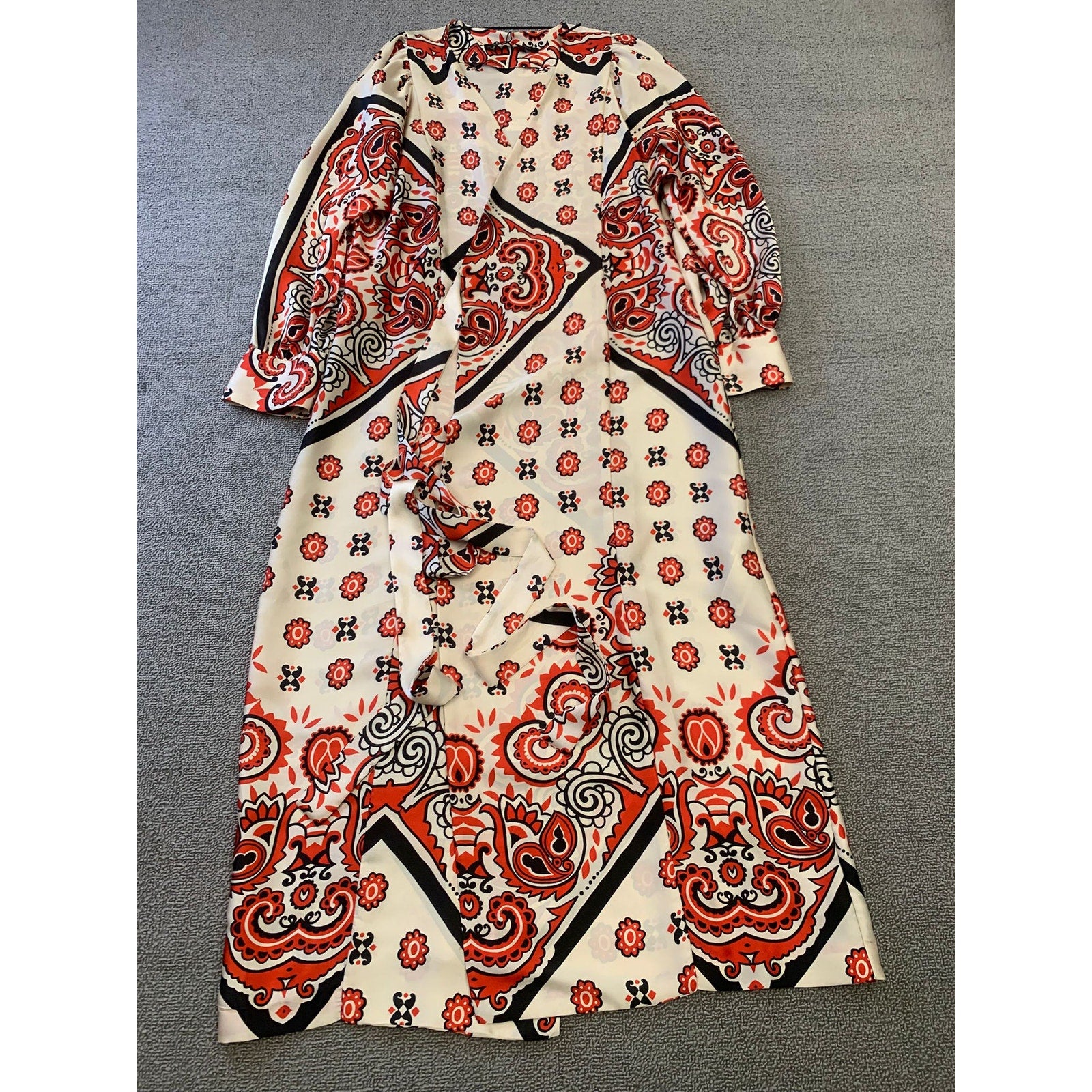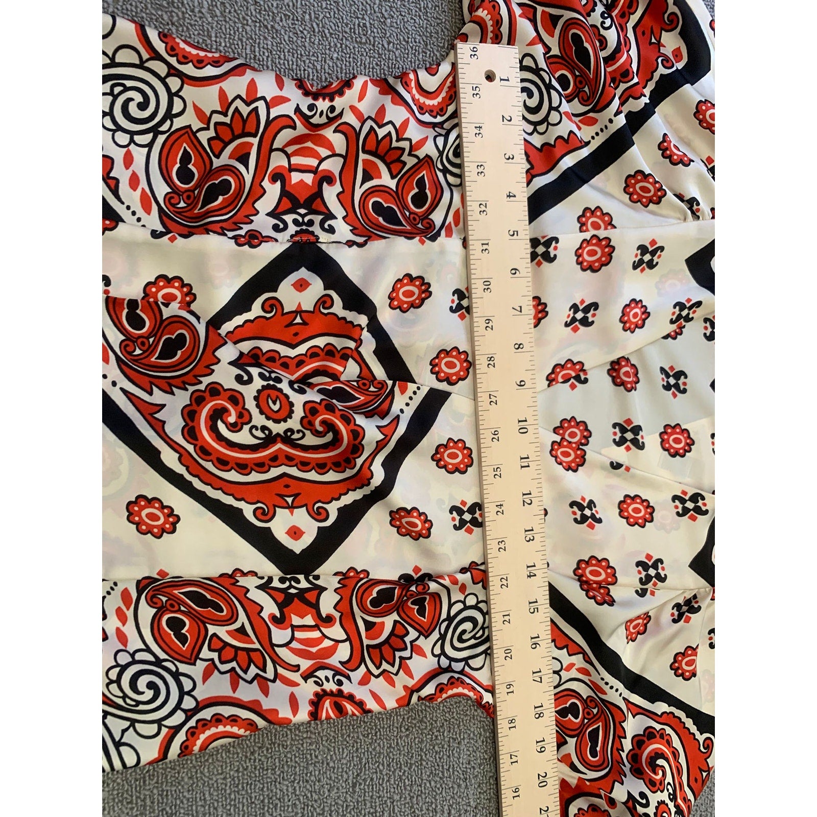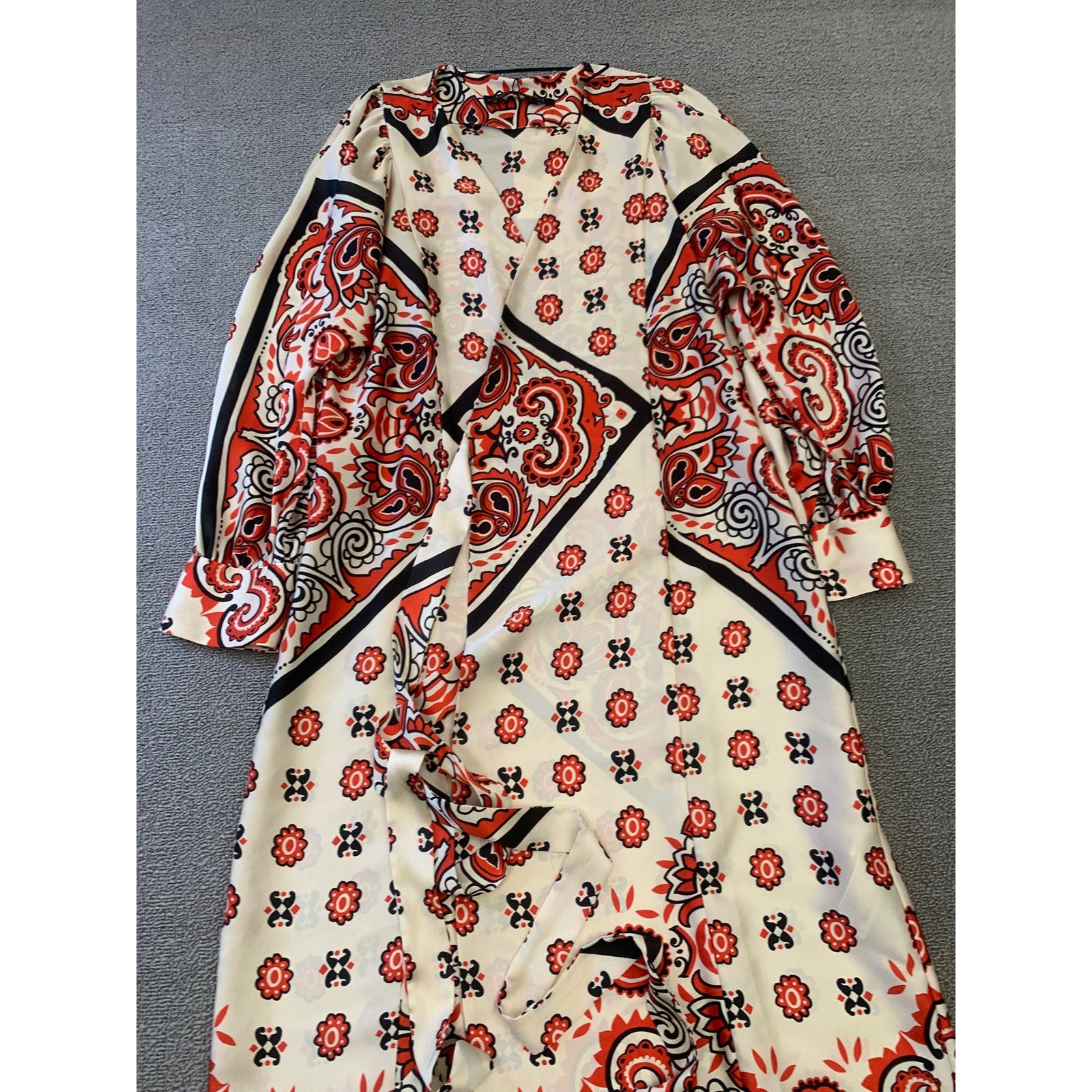 Lightweight wrap‐style midi dress from Zara Woman featuring a bold red, black, and white paisley and floral print, with long sleeves and a self‐tie waist for adjustable fit—flowy and elegant.